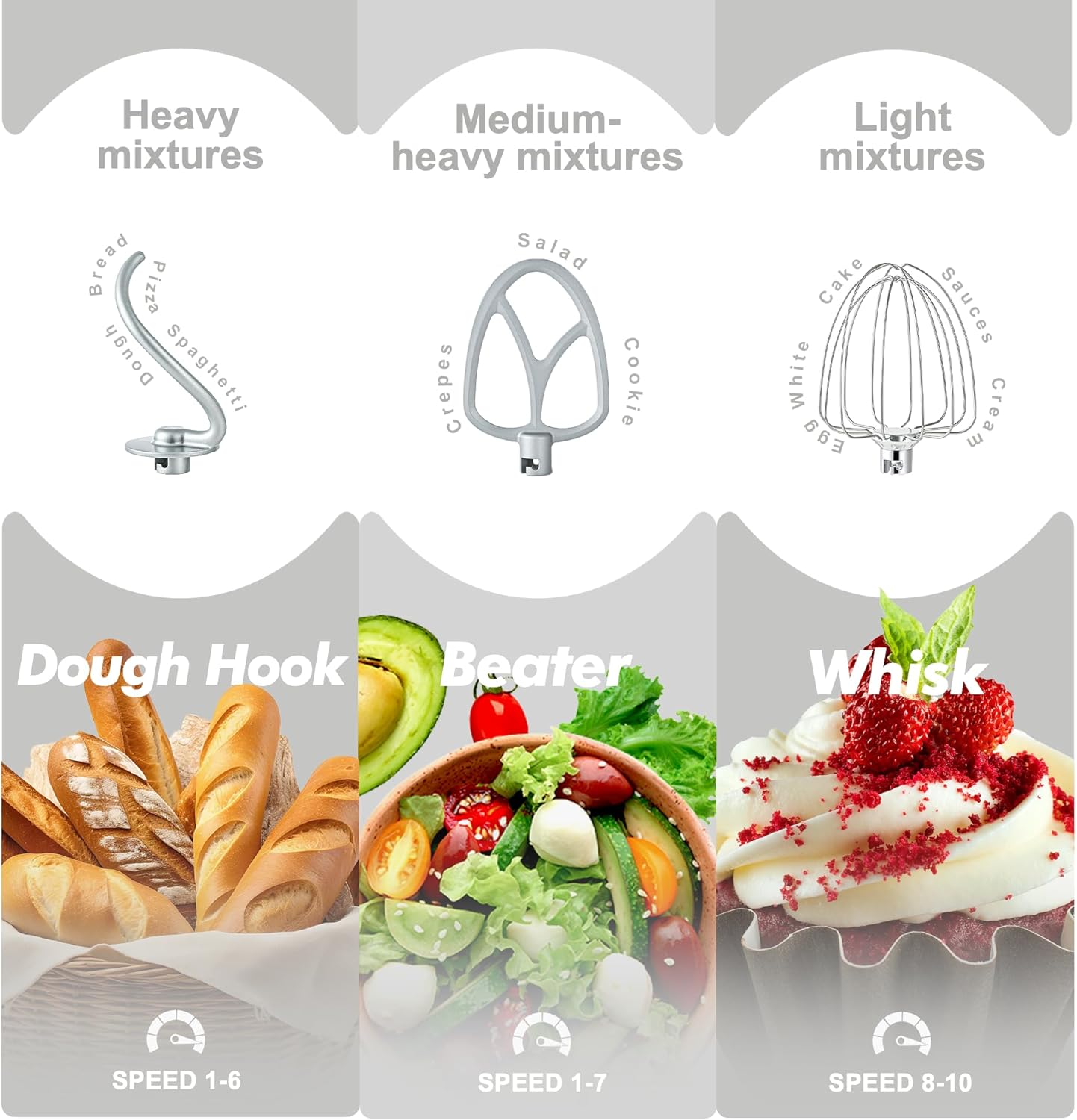 - Upgraded Accessories and Dishwasher Safe- Aluminium dough hook and flat beater with protection layer,stainless steel whisk are all easy to attach,more sturdy and durable. All of the attachments for the food mixer are dishwasher-safe for quick and easy cleaning.