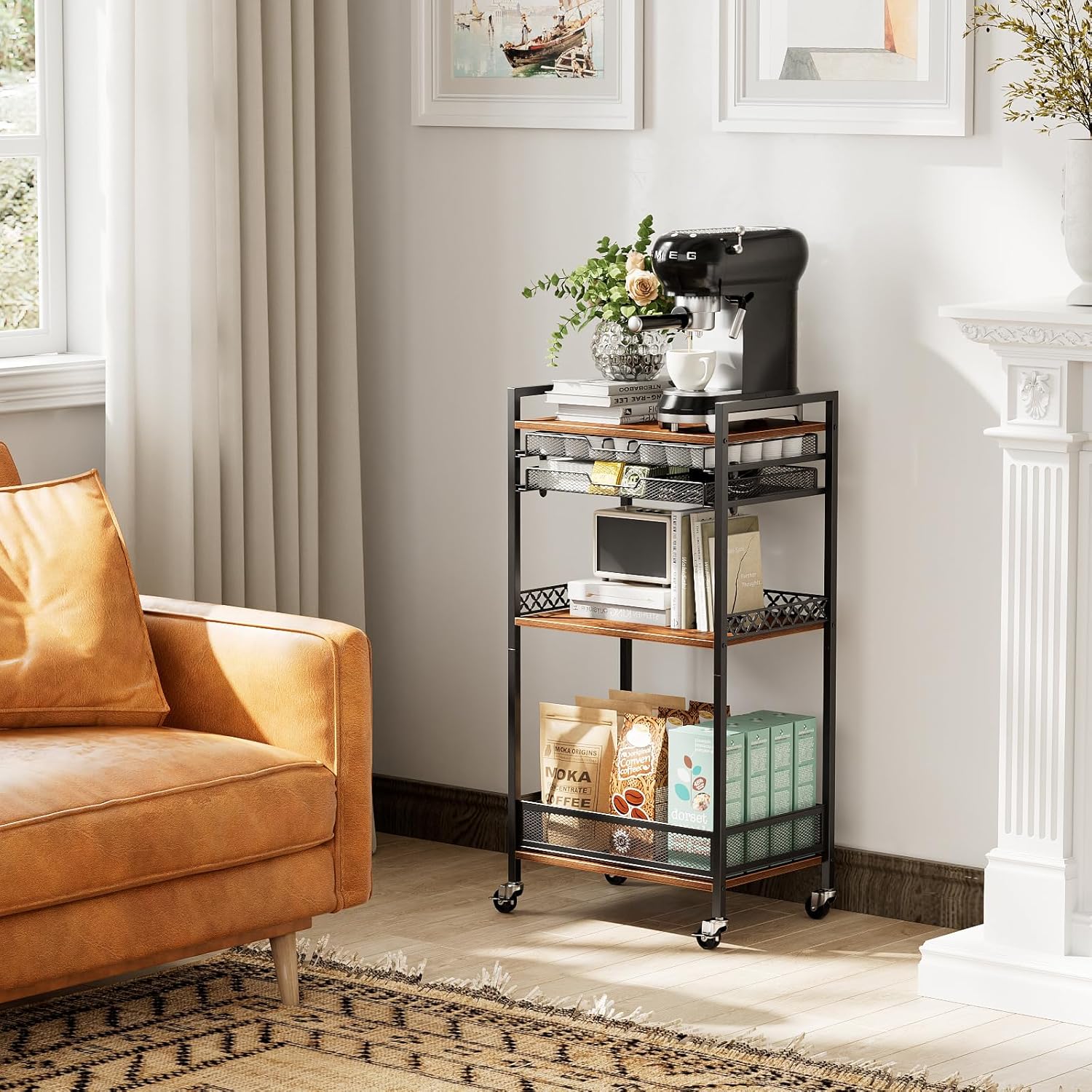 - 【Premium Material Construction】The coffee bar cart is made using steel and MDF for unrivalled stability and durability. It also maintains long-lasting stability for everyday use, and the wheels are designed to allow for easy position changes at any time in the kitchen, dining area, or office coffee station.