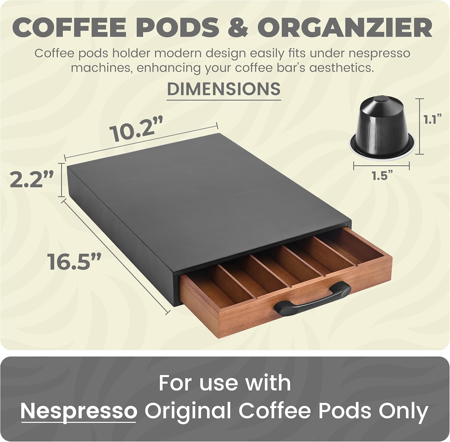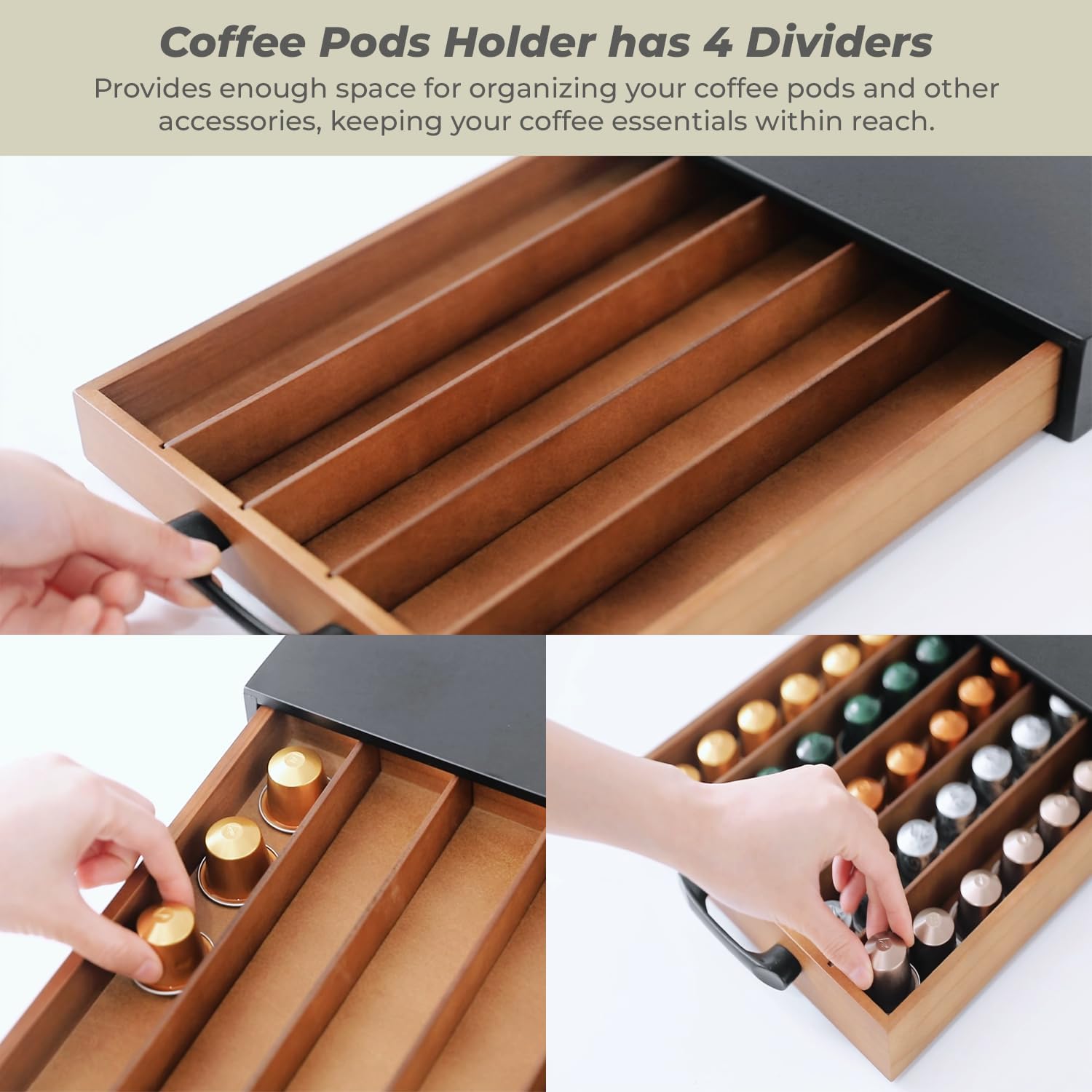 - 🔸 PREMIUM ACACIA WOOD COFFEE POD HOLDER Crafted from black acacia wood with a warm pine drawer, this stylish organizer adds rustic charm to your espresso station or kitchen countertop.