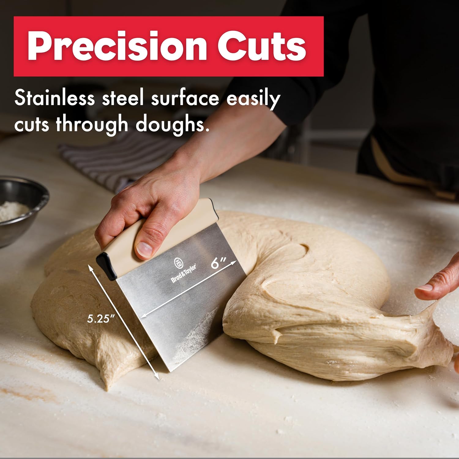 - PRECISION CUTS & PROFESSIONAL RESULTS – The Brød & Taylor stainless steel dough cutter cleanly slices through pizza dough, bread dough, and pastry dough without sticking. Laser-etched 1" markings for easy portioning.