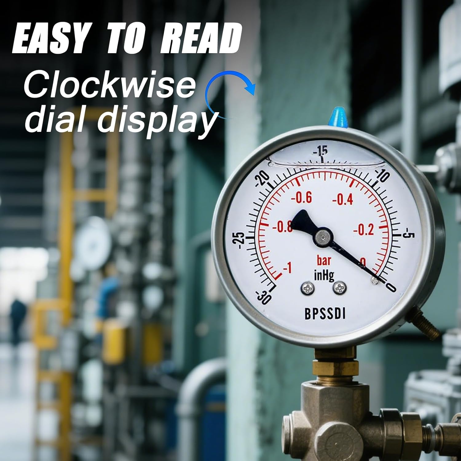 30 inHg Vacuum Silicone Oil Liquid Filled Low Pressure Gauge, 2.5" Dial Size, 1/4" NPT Lower Mount, 304 Stainless Steel Case, for Water Pipe, HVAC, Water Oil Air Pressure Test