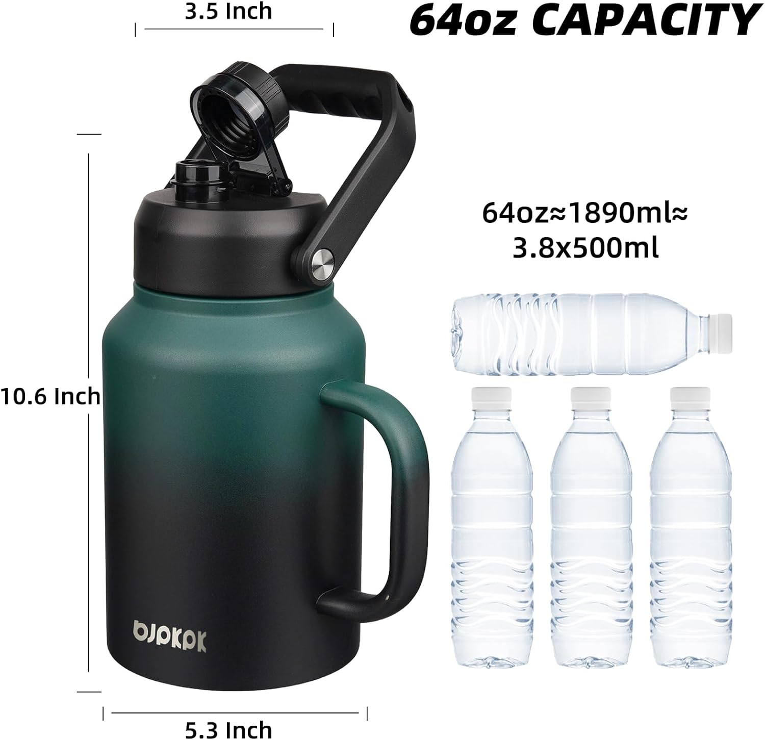 - INSULATED WATER BOTTLE: BJPKPK half gallon water bottle use double-walled vacuum insulation technology to keep your beverage cold for up to 24 hours, or hot for up to 12 hours, make sure you enjoy your favorite beverages at the most suitable temperature all day.