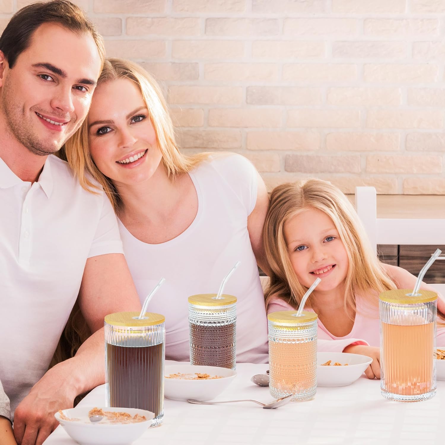 - Product Configuration: The glassware sets include: 14oz ribbed glass cups*4, bamboo lids *4, glass straws*4, straw brushes*2. The size of these drinking glasses is 2.95'' W x 5.82'' H. Our glassware set features bamboo lids and reusable glass straws, promoting an eco-friendly concept.