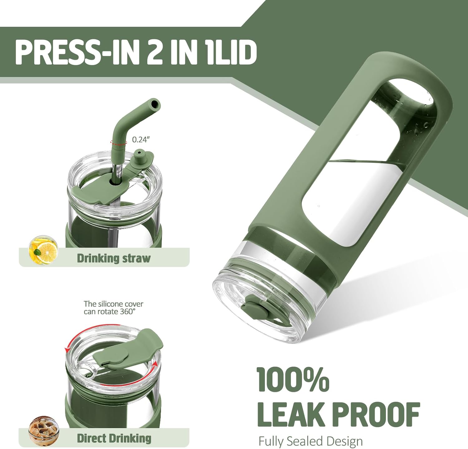 - NATURAL &SUSTAINABLE MATERIALS-Kodrine glass tumbler with lid and straw features with 2 lids-BAMBOO LID and ON-THE-GO LID, also comes with 2 reusable straws + bonus straw cleaner. Food-grade silicone sleeve & non-slip base (BPA-free),High borosilicate glass(odor/taste resistant)