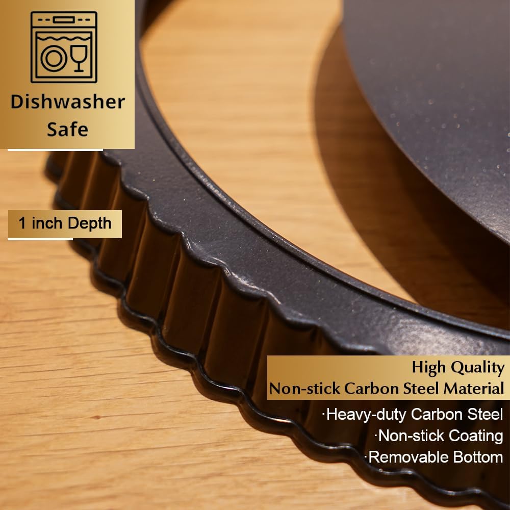 - 【Versatile use】9 inch tart pan(1 inch depth) is convenient to make suitable sizes of fruit tarts, quiches, cheesecakes, desserts, pizza. You can make some mini cake, chocaolate tarts and others in Christmas, Birthday Party, Halloween, Wedding, Easter and Father's Day Mother's Day.