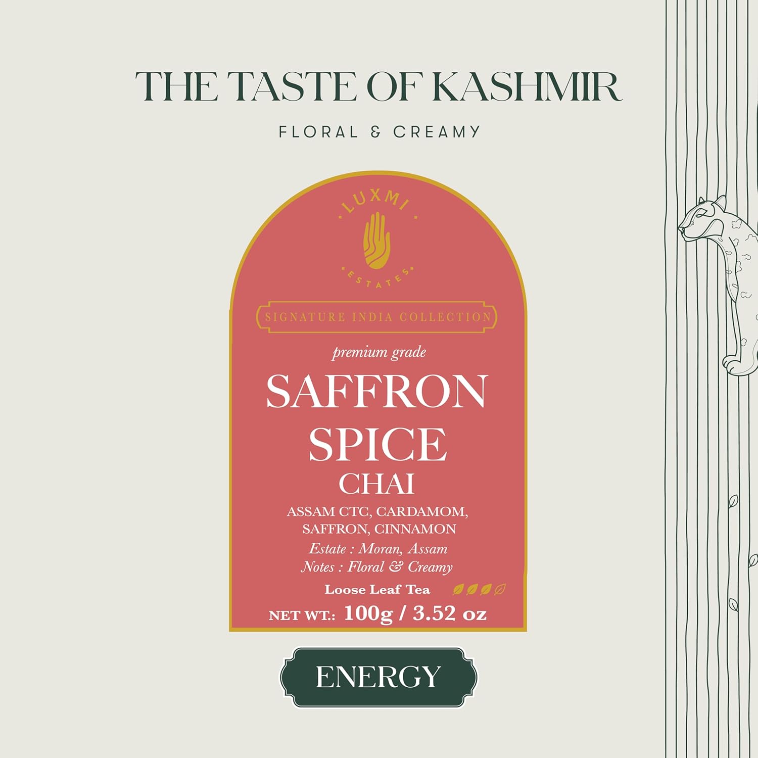 Luxmi Estates Saffron Chai | 100 gm | Signature India collection | Assam CTC Tea | Black tea collection | Saffron chai Organic Strong tea | Antioxidants | Assam Valley tea | Kashmiri Saffron, Cinnamon, Natural Cardamom Extract