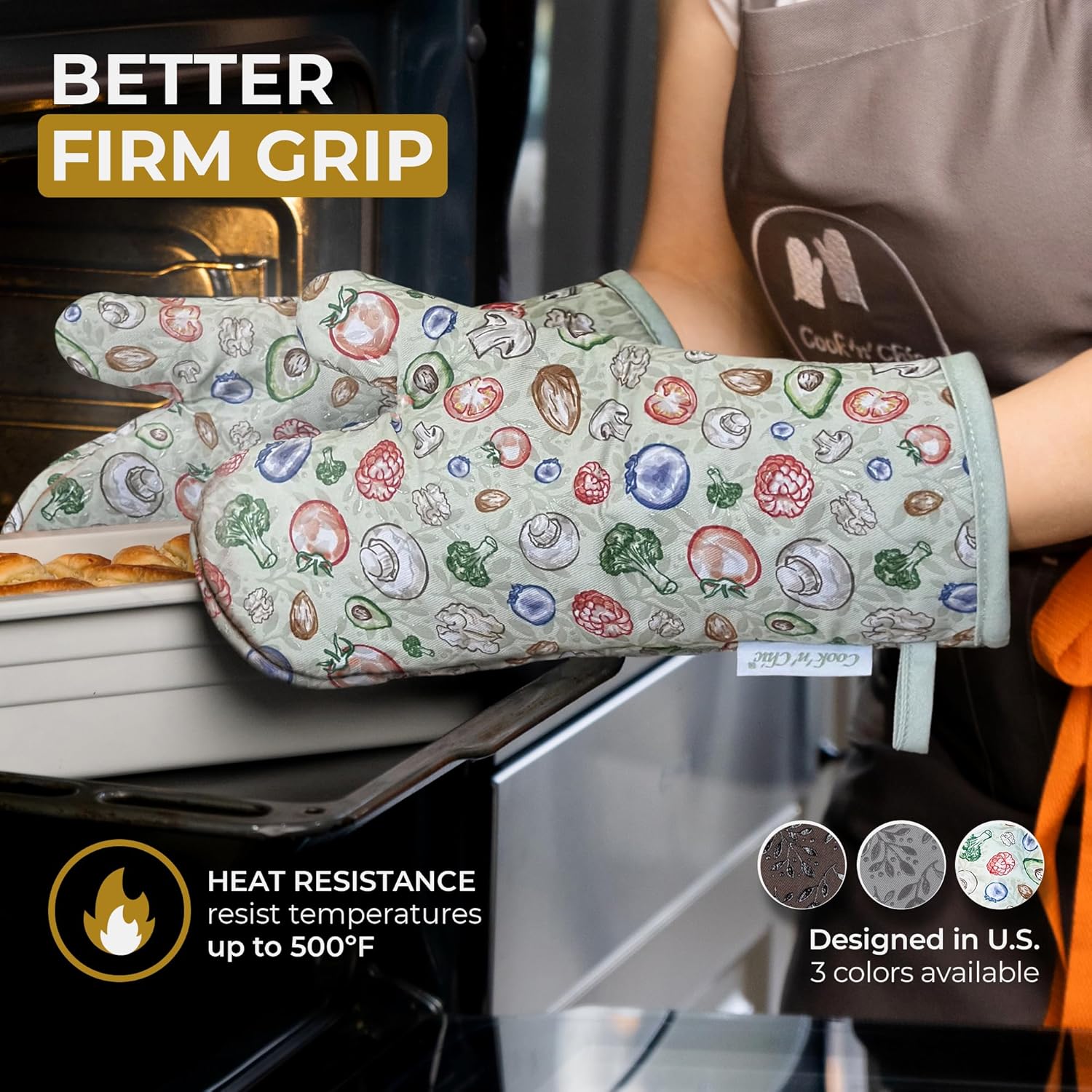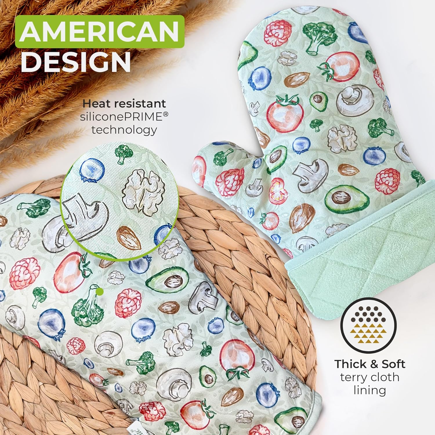 - Heat Resistant: These oven mitts are thick and have an outer surface made from genuine siliconePRIME and are lined with luxuriously soft terry cloth, making them resistant to high temperatures. This, along with their extra-long sleeves (13”), makes them a safe and comfortable choice for cooking or baking in the kitchen.