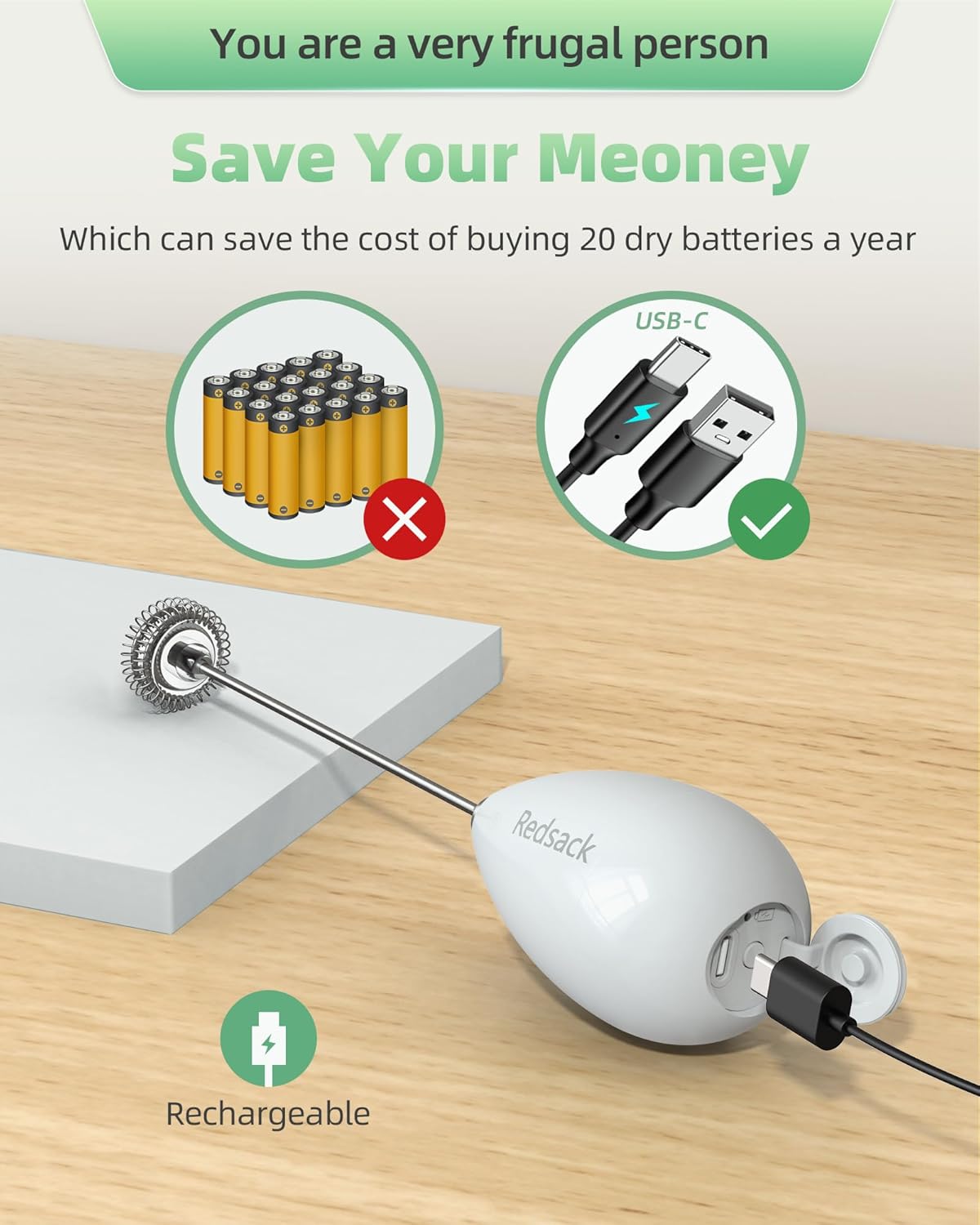 - 【You are a very frugal person】 so we use safe rechargeable batteries, which can save the cost of buying 20 dry batteries a year, and a full charge can make milk foam more than 100 times,save your meoney