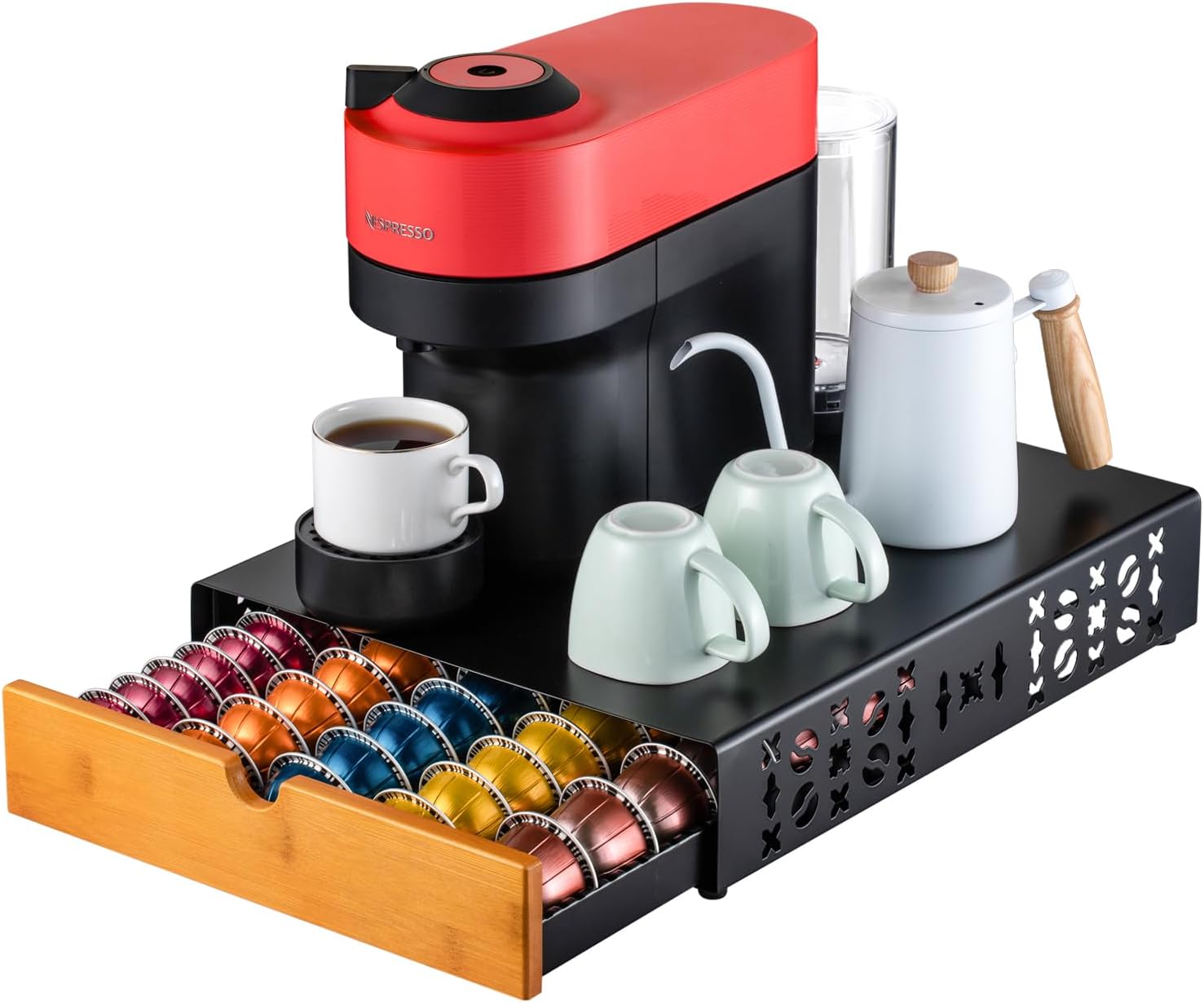 - 【Easy to Organize】Easy to pull out drawer and put in pods offer the best user experience. The hollow place design can be organized your coffee capsule easily.