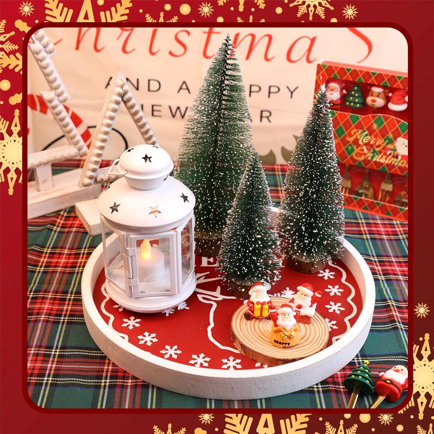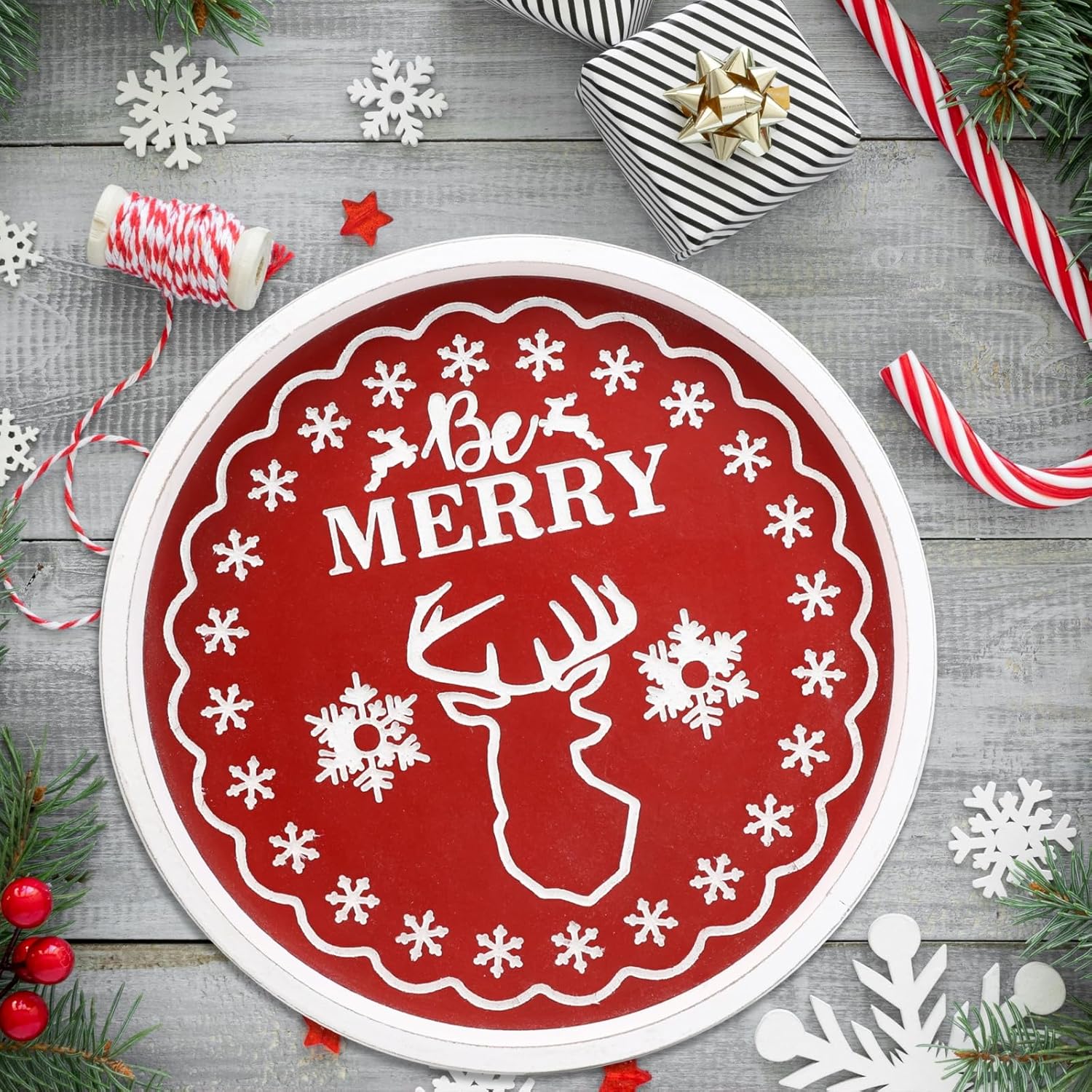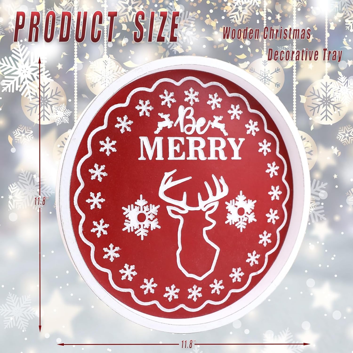 Christmas Reindeer Wood Decorative Ottoman Tray for Coffee Table Kitchen Counter, Living Room, Round Handcrafted Red Wooden Serving Tray for Table Centerpiece