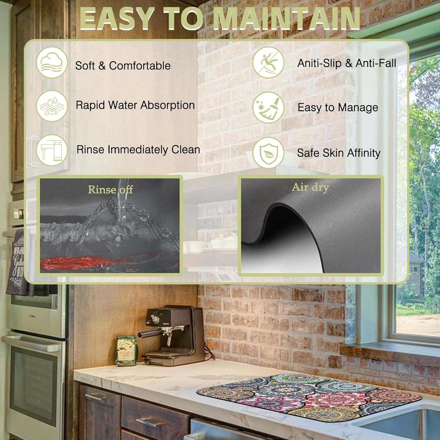 Dish Drying Mat Bohemia Vintage Decorative Pattern Kitchen Mat 12"x19" Bsorbent Coffee Maker Mat for Dishes,Utensils Coffee Maker Pots and Pans Easy Clean Dish Slip Resistant Pad