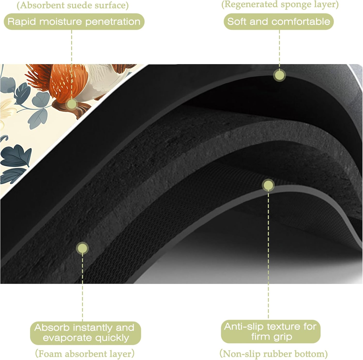 - Super absorbent and non-slip:This kitchen mat absorbent layer is made of absorbent suede and diatom mud,the surface porosity of the product is as high as 85%,which can quickly absorb water and stains,the texture design on the back is more non-slip