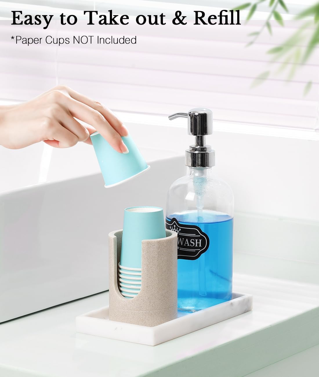 - Keep Cups Tidy: Using a dixie cup holder is better-looking and more sanitary than stacking cups on the table. With all the cup openings facing down, the organizer keeps your cup clean and dust-free. The holder also protects cups from water on the bathroom countertop. Classy marble and wood pattern, giving a neat and elegant look to the countertop.