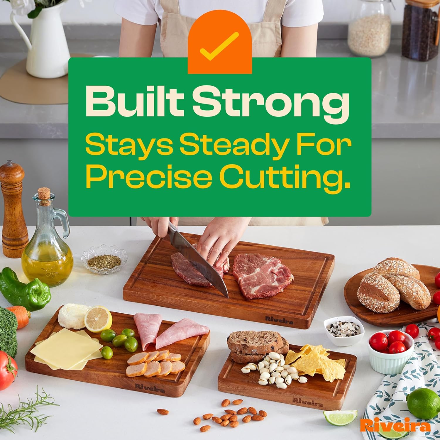 - No Mess Cutting and Transfer — Enjoy a mess-free kitchen with our wood block cutting board walnut. Equipped with deep juice grooves, these hardwood cutting boards for kitchen catch liquid runoff from meat, fruit, and other ingredients, preventing spills and countertop messes. Whether you're working in an industrial restaurant kitchen or your home, this walnut cutting board set makes cleanup a breeze. Transfer ingredients from your prep station without any fuss with Riveira wooden butcher block.