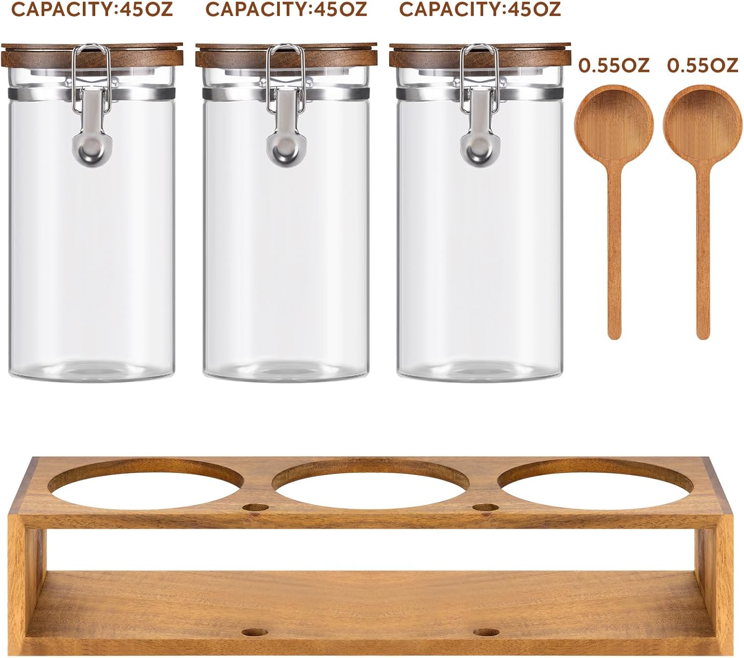 Yangbaga Glass Sugar Coffee Canister with Shelf, 3 x 45OZ Coffee Bean Containers Storage Station Organizer with Airtight Locking Clamp and Log Coffee Scoop, Food Storage Canisters Sets for Kitchen