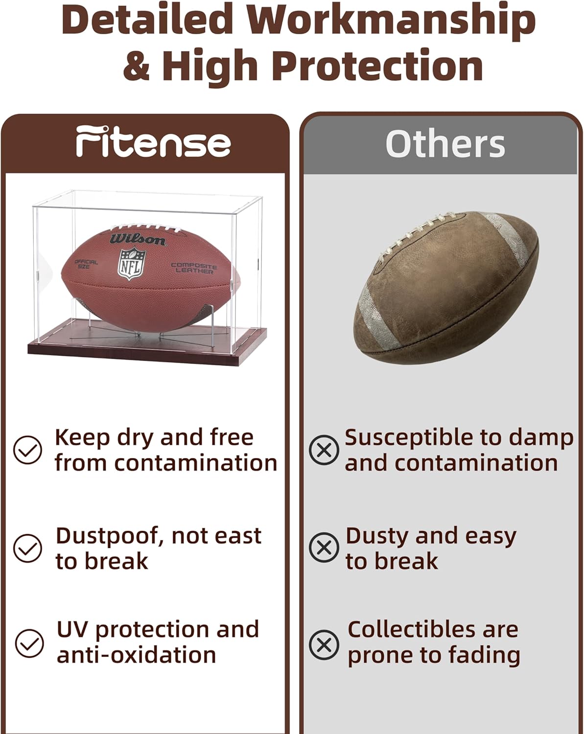 - Hassle-Free Assembly & Innovative Design: Experience the convenience of Fitense football display case, ingeniously crafted for easy setup and interaction. Features traditional mortise and tenon joints for stability and durability, no nails or glue needed to quickly assemble the acrylic box. Just 1 Minute, all done! PS: Before assembly, please remove the protective film from the acrylic border