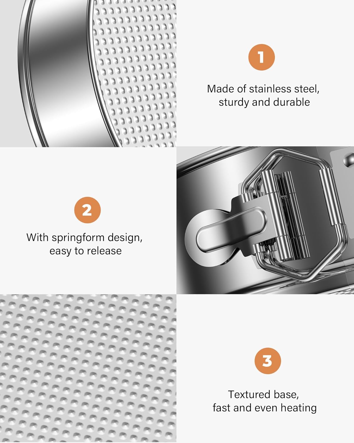- Premium Material: Round Cake Pan with 304 Stainless Steel: Crafted with food-grade 304 stainless steel, this 9 inch springform pan reduces the risk of rust/coating peeling (BPA-free & heat-resistant). Ideal for health-conscious bakers seeking durable cake molds for baking cheesecakes, quiches and layered desserts;