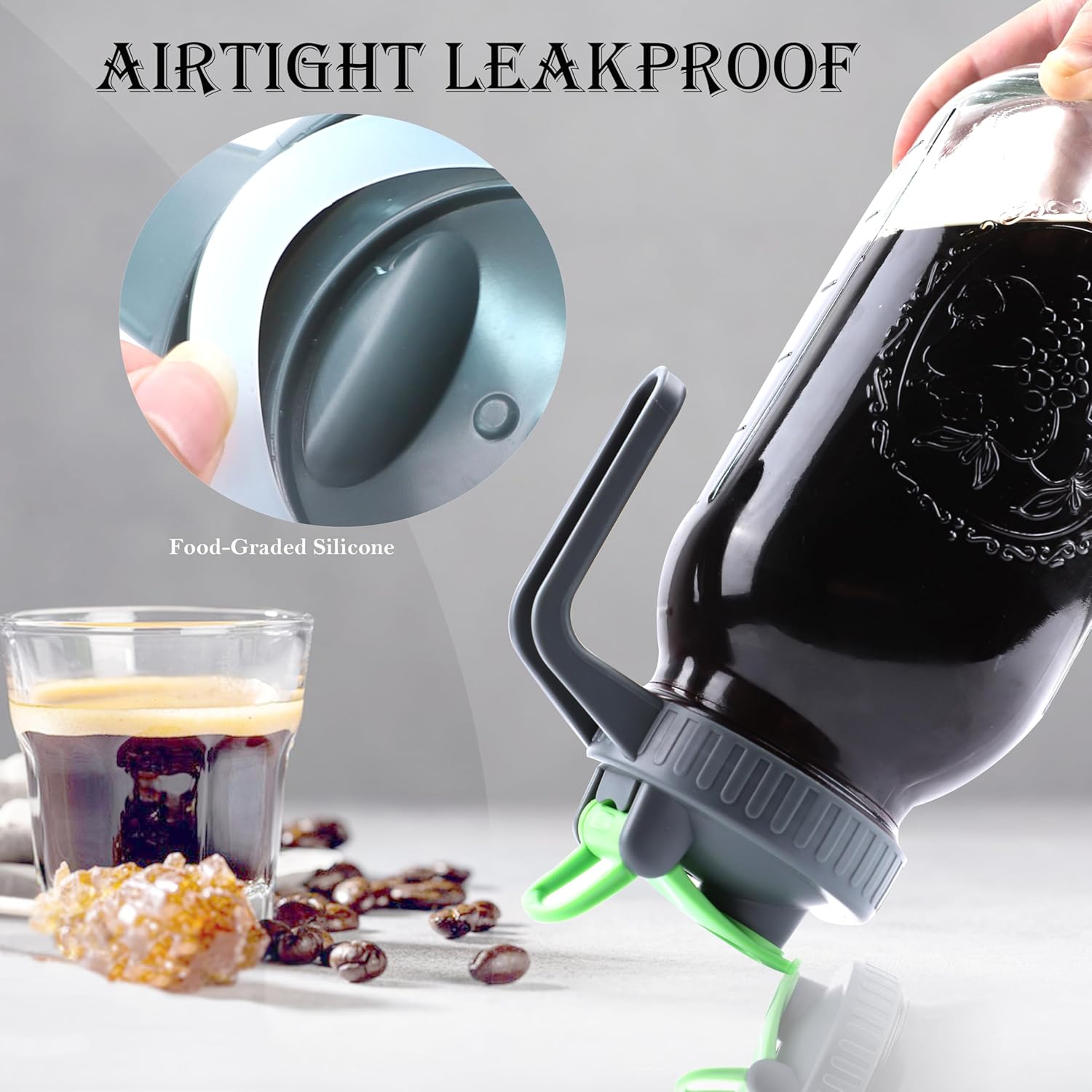 - LEAK PROOF & AIRTIGHT STORAGE - Mason Jar coffee Pitcher with silicone seal that will ensure not leak what so ever (even while shaking it upside-down). The top flip cap has a secure snap fit closure that will not leak neither. Airtight container to keep your drinks fresh