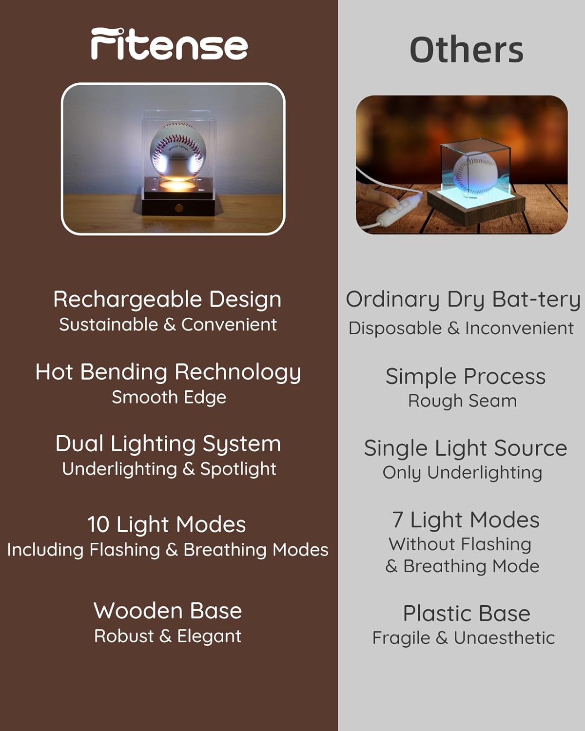 - Light Up Baseball Display Case: Unlike traditional baseball box display case, Fitense elevates the presentation with integrated LED lights positioned at the base and beneath the acrylic stand. These carefully placed lights create a striking focal point, ensuring that your prized baseball shine with exceptional brilliance, even in the dimmest of settings