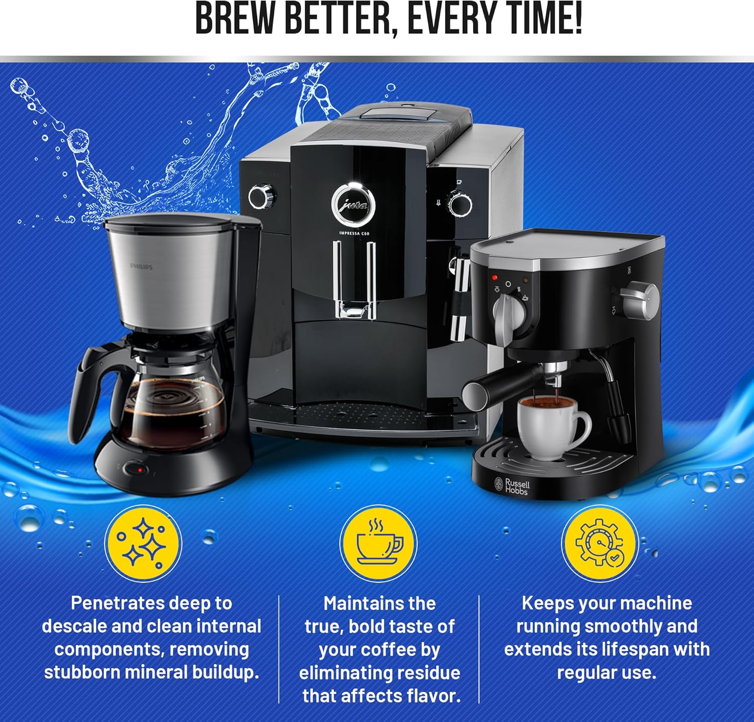 - Versatile Compatibility: These descaler tablets are designed to work seamlessly with all major coffee machine brands and models, including Keurig, Nespresso Vertuo, Breville, Ninja, Braun, Cuisinart, Affresh, Philips, De Longhi, biocaf, Dezcal, Oxo, and more. Whether you’re maintaining a pod-style system or a multi-cup drip machine, Bastion’s universal formula offers the convenience and flexibility you need. Simplify your routine with a single solution that tackles the toughest challenges, so you can focus on enjoying your favorite brews without interruption.