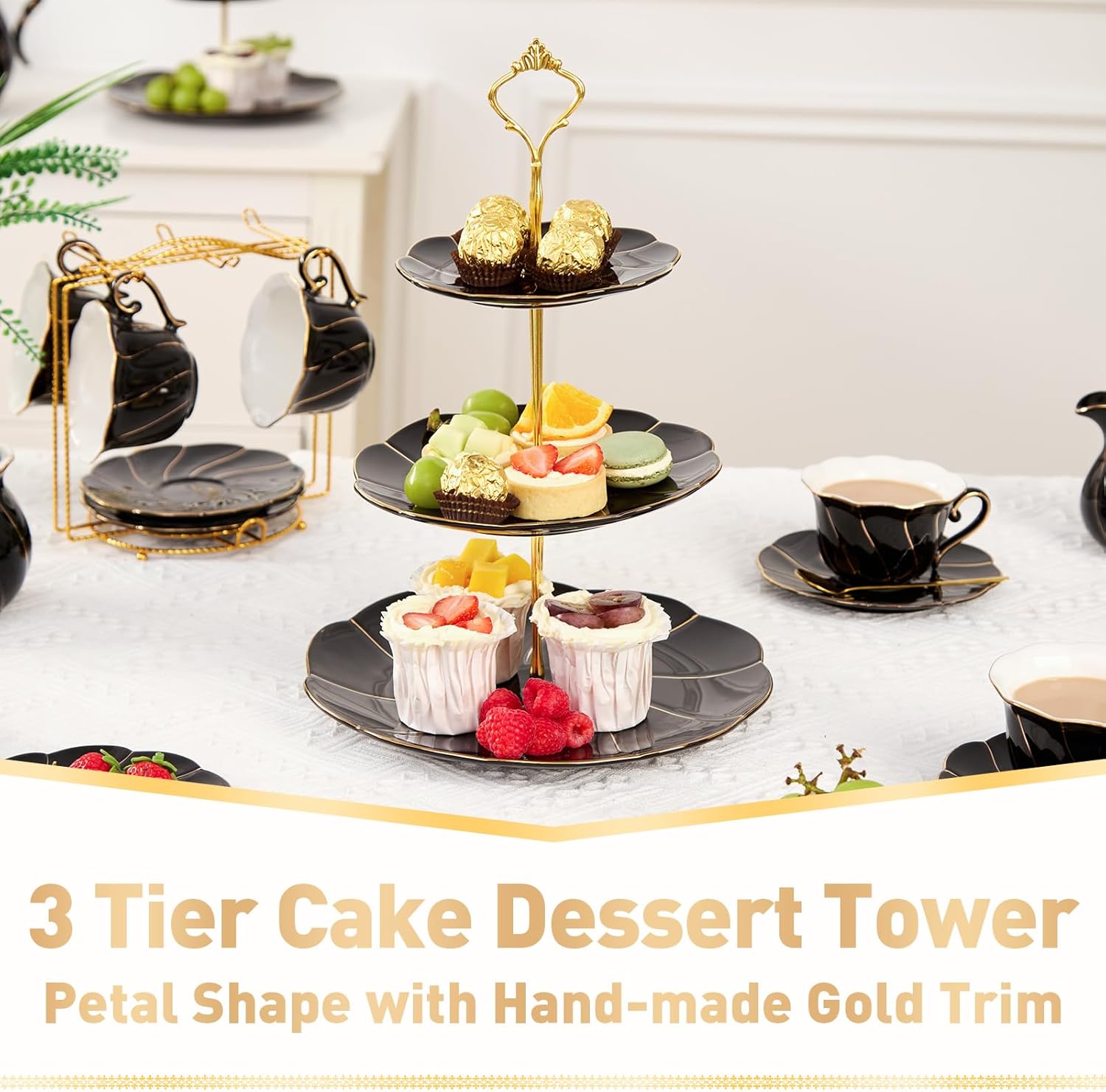 - 【3-Tier Luxury Porcelain Stand, Elevate Your Dessert Display】DUJUST 3-tier cake stand features black porcelain plates with an elegant petal shape. Adorned with a delicate golden rim, it exudes luxury. Look at the top gold handle, it will remind you of a queen's crown, unique and exquisite. On this stand, you can show carefully prepared dessert snacks and cakes, and make your party perfect. Ideal for entertaining friends, this stand offers a refined way to savor life's sweet moments.