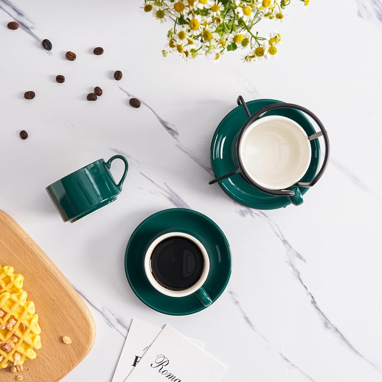 - 1.Elevate your kitchen experience with the MEICHU Espresso Cups Set. This set includes 4pcs 8 Ounce Espresso Cups with Saucers and Metal Stand, all in a classic green color. Perfect for people who enjoy coffee and conversation!