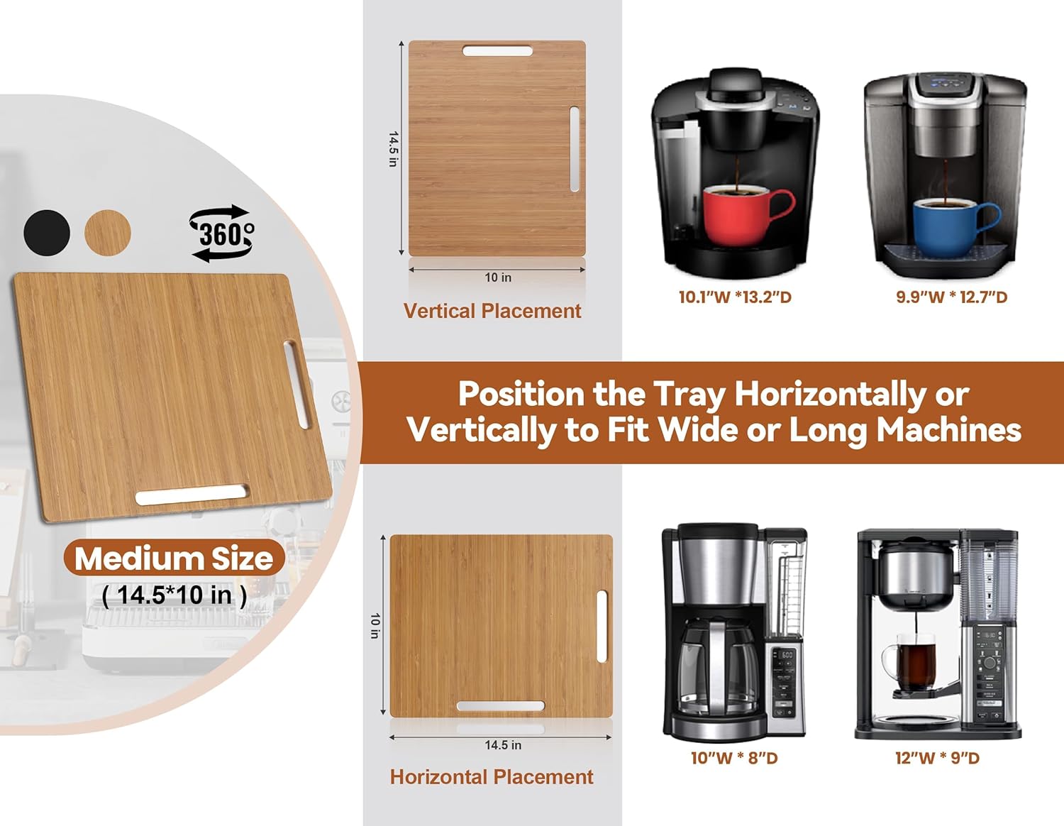 - Dual-Mode Appliance Sliding Tray: Equipped With 360° rollers, this appliance slider offers One Size Fits ALL: supporting both Wide and Long Machine. The Large Size (can be used as 16"W x 13"L or 13"W x 16"L) is suitable for Instant Pots, large coffee makers, espresso machines, air fryers, stand mixers, and toaster ovens. The Medium Size (can be used as 14.5"W x 10"L or 10"W x 14.5"L) fits medium to small coffee makers, pots, coffee grinders, and toasters.