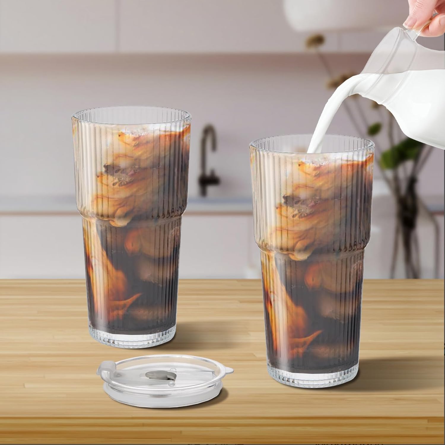 20oz Ribbed Glass Cups with Lids and Straws 2 Set, Vintage Glassware for Whiskey Cocktail Beer, Glass Tumbler, Iced Coffee Cups For Cold Drinks, Smoothie, Juice,Drinking (6)