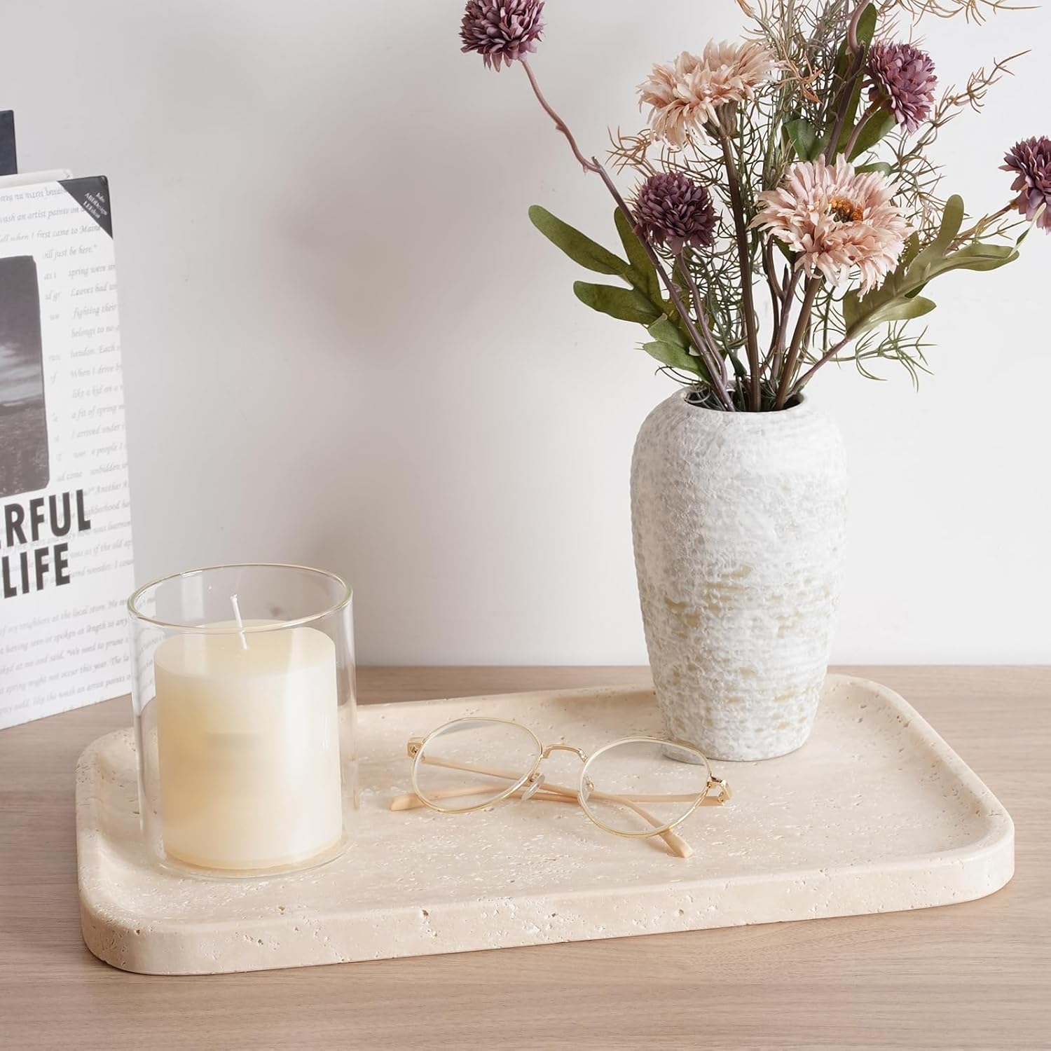 Travertine Vanity Tray, Stone Bathroom Tray for Countertop, 14'' Marble Decorative Dresser Trays, Large Serving Trays for Kitchen Counter, Storage for Kitchen Sink, Perfume, Jewelry Holder