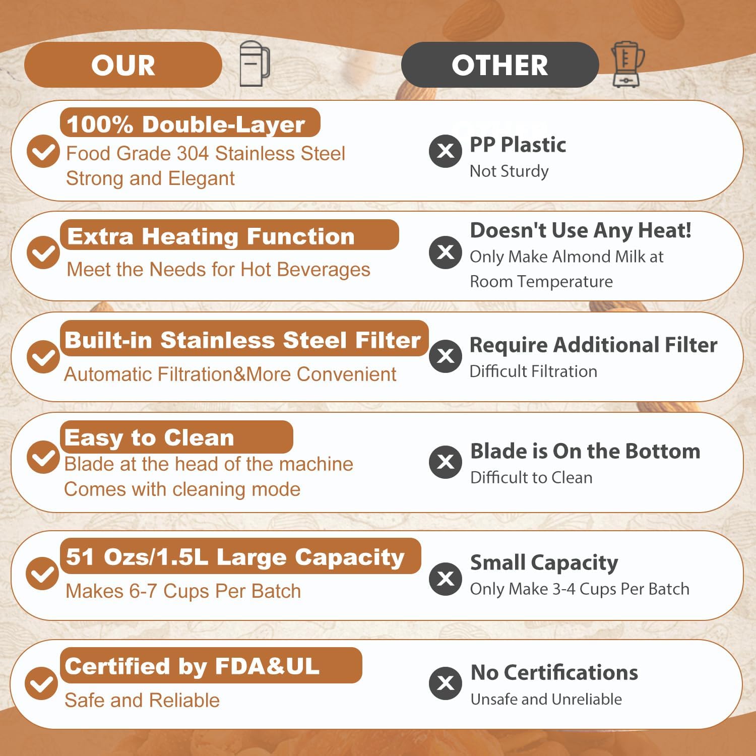 - Durable Double-Layer 304 Stainless Steel Design: Built to withstand the test of time, our almond milk maker boasts a robust double-layer design made from high-quality 304 stainless steel. This food-grade material not only ensures the longevity of the product but also guarantees that your drinks are healthier and smoother, free from harmful chemicals. Enjoy peace of mind knowing you can create 100% organic homemade milk while being fully aware of the ingredients in your beverages—good for you and the planet!