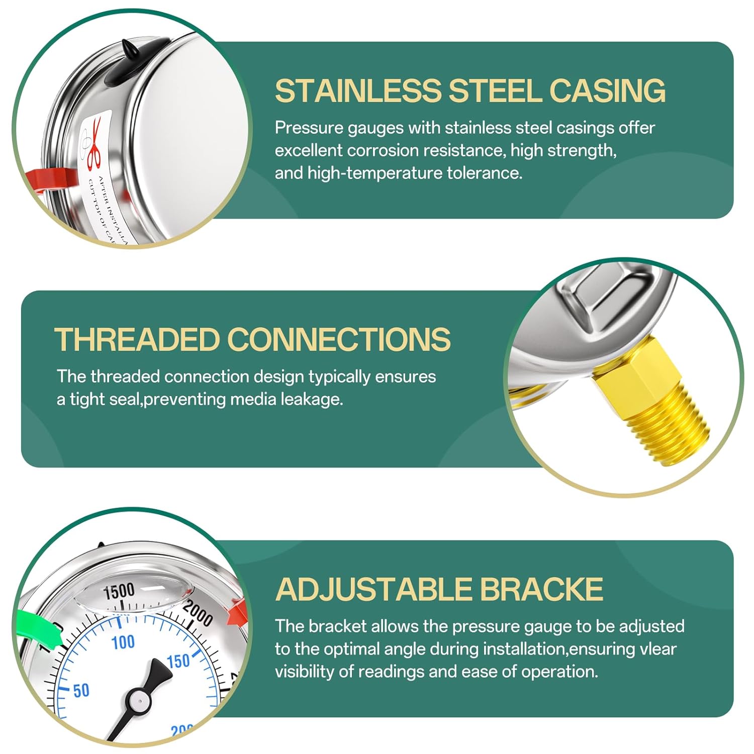 - [MATERIAL FEATURES] 304 stainless steel housing, corrosion-resistant, glycerin filled for stable readings and to avoid vibration damage.