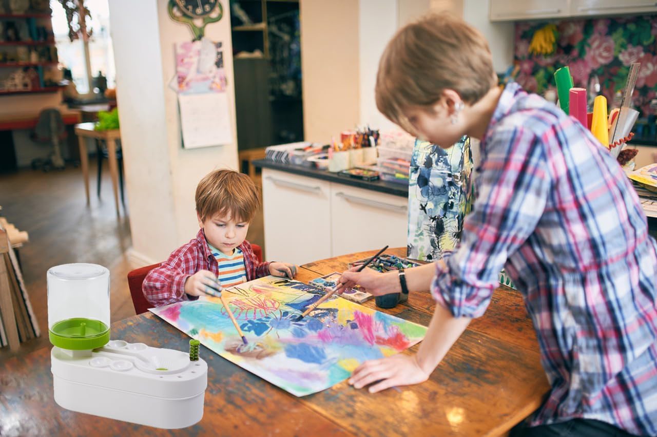 - 【Eco-Friendly & efficient】No more washing all your brushes in a bucket of water, that quickly collects dirty water and dispenses fresh water at the push of a button. This design can make cleaning up to 2 times more efficient reducing water consumption by up to 10 times. The 250ml fresh water bottle allows for approximately 30 cleanings without frequent water changes, promoting sustainability while offering convenience in your creative process.