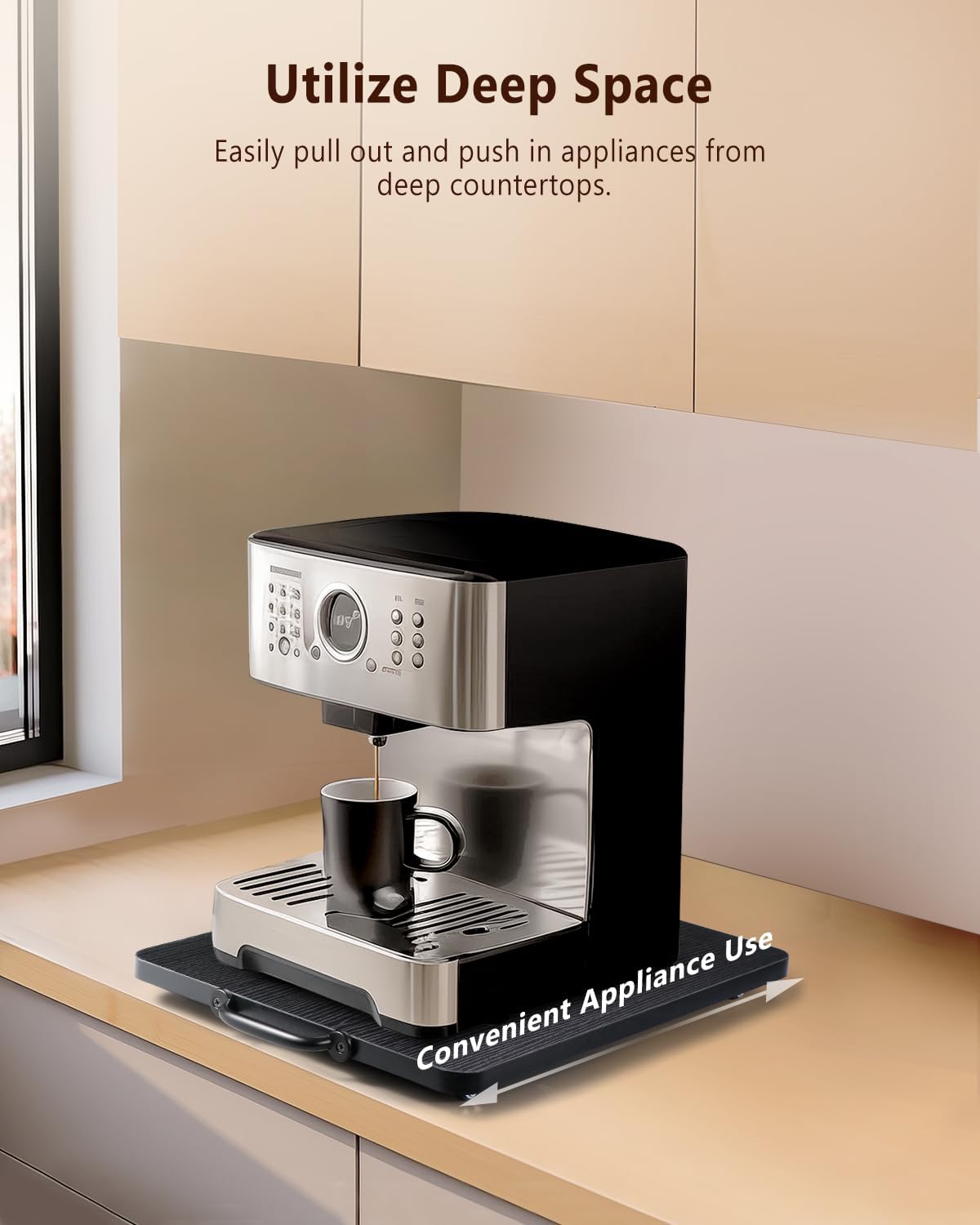 - Efficient Space Utilization: With space-saving handles and easy-glide sliders, our Appliance Tray maximizes space and simplifies mobility; serves as a kitchen tray for counter and slide out tray for coffee maker, optimizing your countertop space