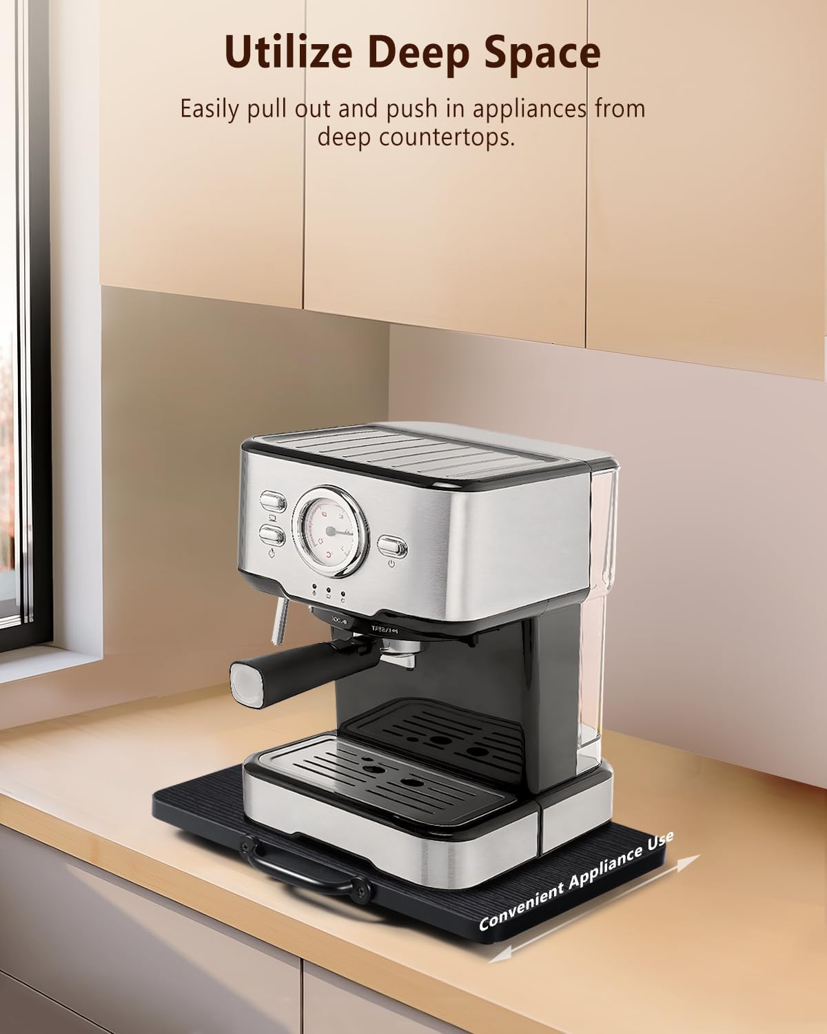 - Long-lasting & Sturdy: Our Appliance Tray supports up to 40 lb; it’s a sliding coffee tray for countertop that blends with any decor; a durable coffee slider for countertop, combining strength and style for your kitchen or dining area
