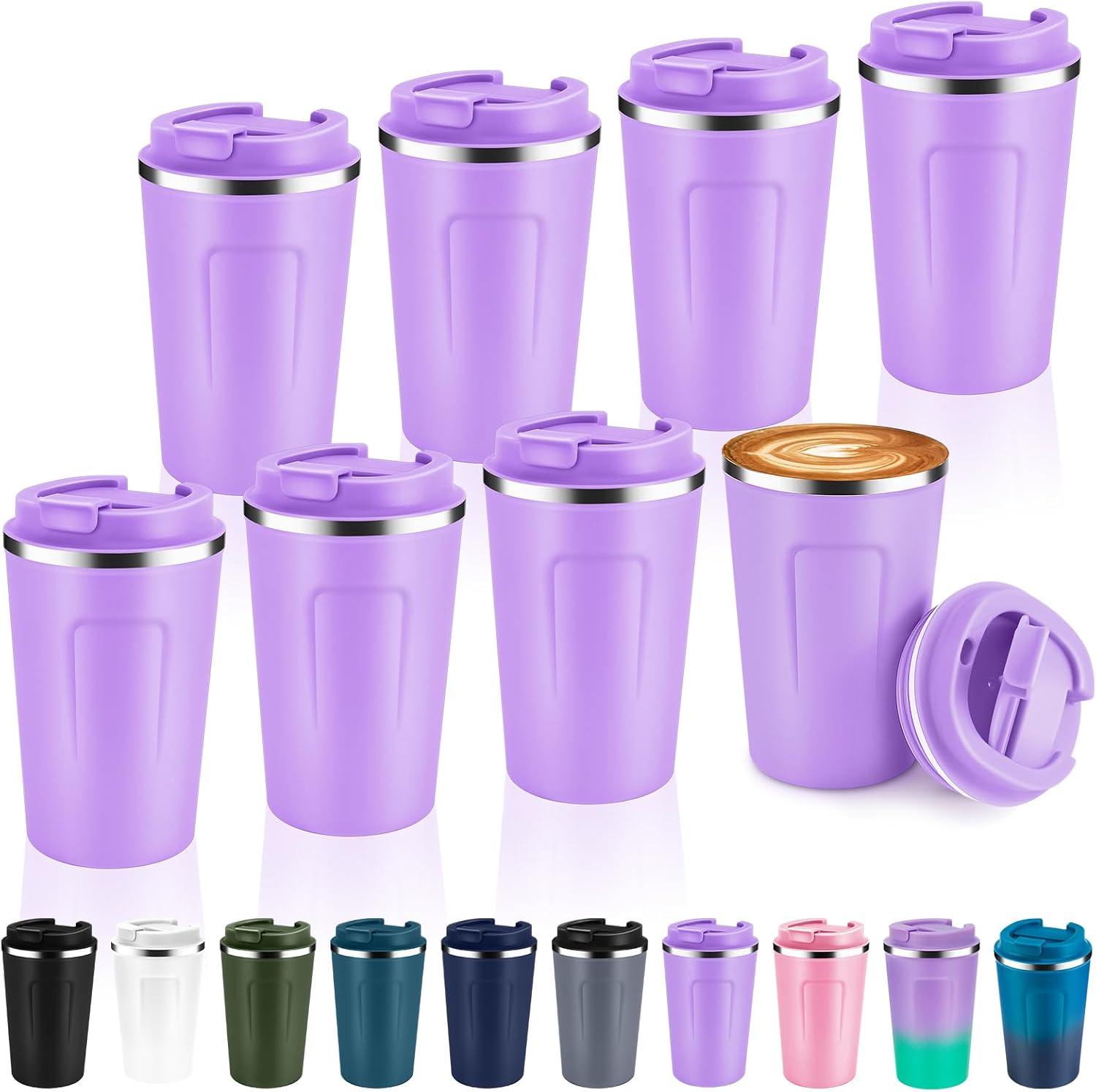 Volhoply 12 oz Double Wall Insulated Vacuum Travel Coffee Mug with Flip Lid Bulk 8 Pack,Reusable Stainless Steel Leak Proof Coffee Cup,Portable Cafe Thermal Tumblers for Hot&Cold Drinks(Purple,8 Set)