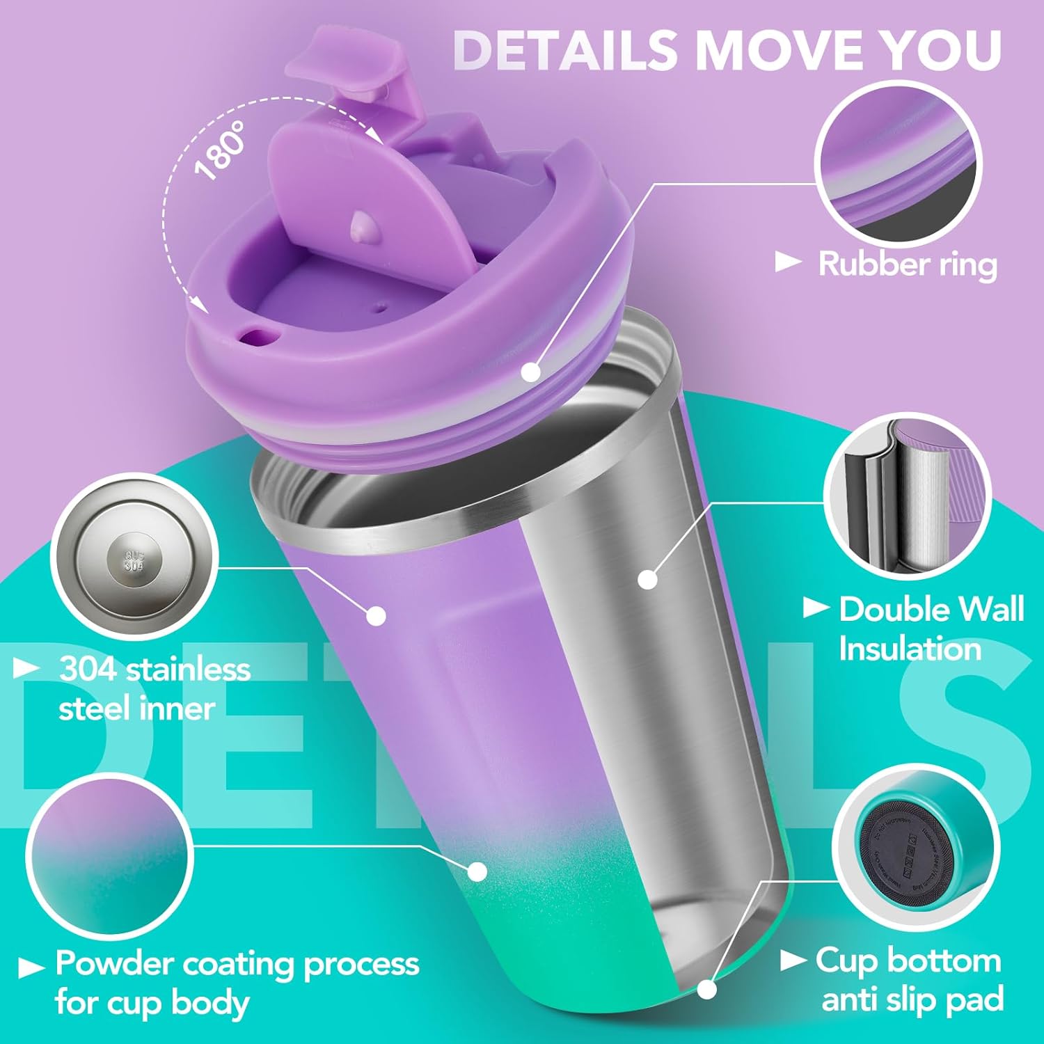 Volhoply 12 oz Double Wall Insulated Vacuum Travel Coffee Mug with Flip Lid Bulk 4 Pack,Reusable Stainless Steel Leak Proof Coffee Cup,Portable Thermal Tumbler for Hot&Cold Drinks(Purple Green,4 Set)