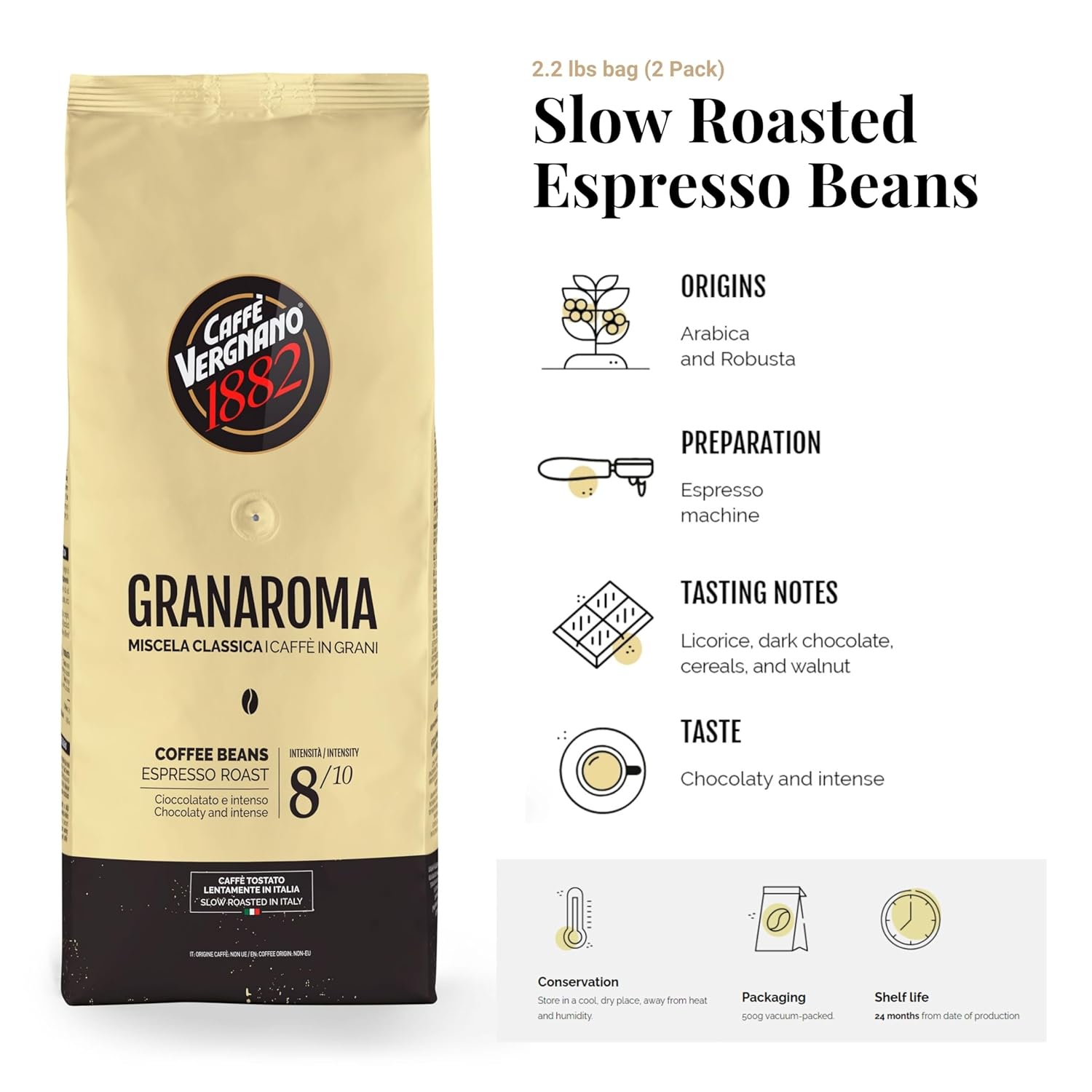 Caffe Vergnano 1882 Gran Aroma Whole Bean Arabica Medium Espresso Roast Coffee, 2.2lbs Bag - Italian Coffee Beans with Rich notes of Cocoa, Spices & Dried Fruit, Intensity 8/10-1000g Bag (2 Pk)