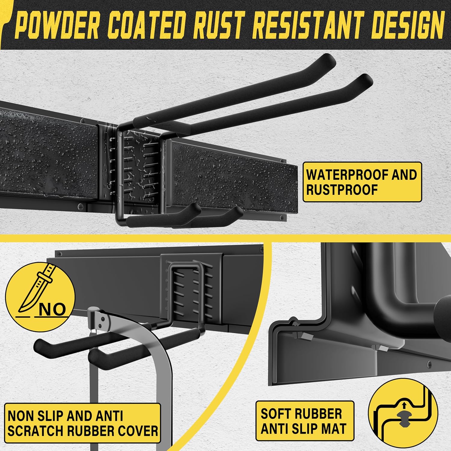 - IMPROVED DESIGN:Yard Tool Organizer for Garage.Double Upper Hooks:Wider Spacing to 2.48 inches.Double Lower Hooks:Wider Spacing to 2.52inches.Fulfills More Hanging Needs.Equipped With 9 Hooks(3 Double-Layer Hooks,3 Single Level,3 Small Hook,3 Nylon Taping) and 3 Rails.