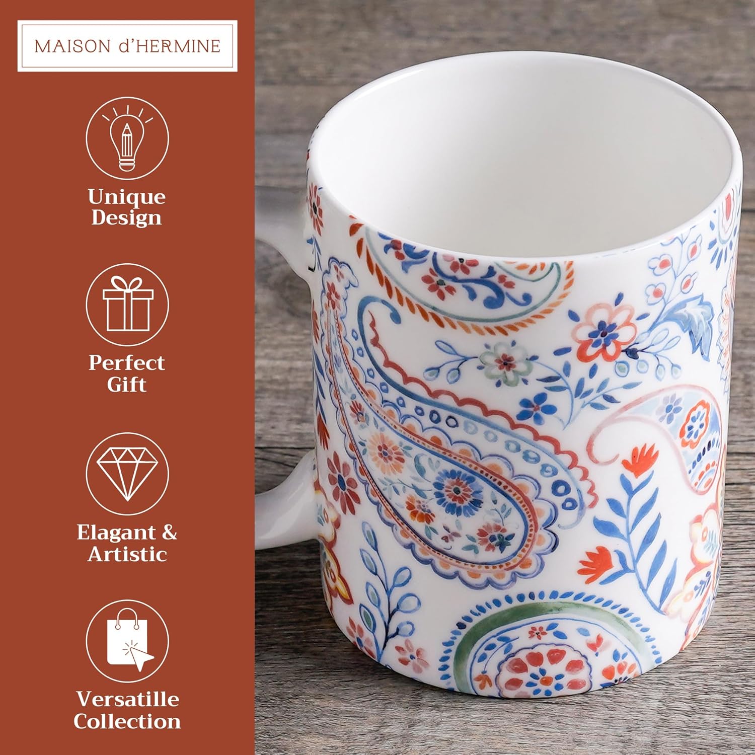 Maison d' Hermine Coffee Mug with Handles Fine Bone China Mugs Pack of One Tea Cups for Hot Beverages Cappuccino Latte Home Restaurant Office Perfect for Gift (Indian Floral - Paisley, 15 Ounce)