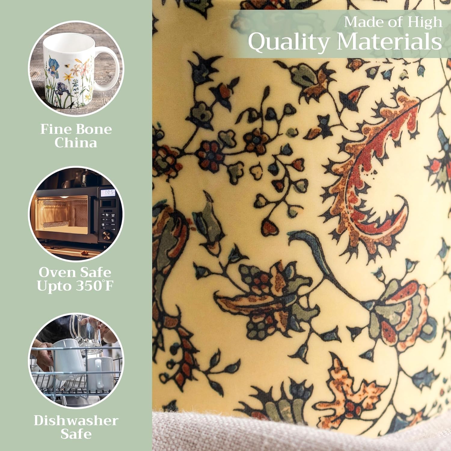 - Easy Care & Maintenance: Microwave, dishwasher, and oven safe up to 350°F. These bone china mugs are built for convenience and durability, making cleanup and reheating simple without compromising on quality