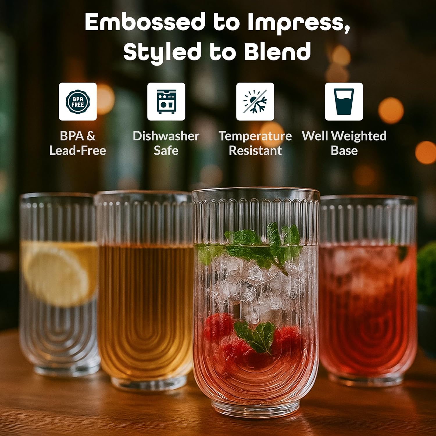 - ELEGANT DESIGN: These highball glasses boast an embossed textured geometric arch pattern, adding a touch of sophistication to your everyday or bar drinkware. These Bar and Kitchen Glassware glasses feature a vintage, “embossed arched” design, which is easy to mix and match with any table décor. Whether for special events or everyday use, the modern design will definitely be a hit.