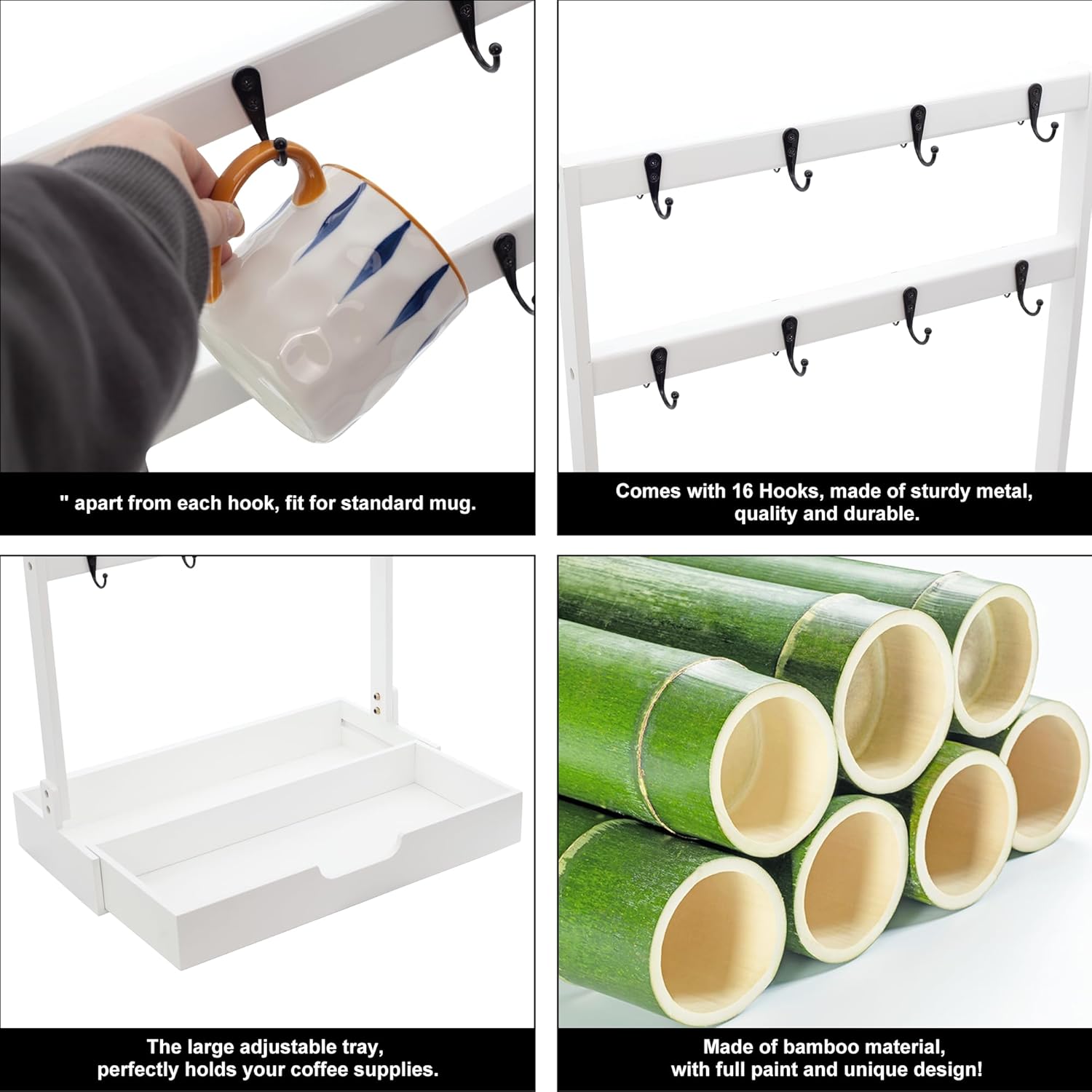 - Ample Capacity for 16 Mug Cups: MinBoo classic coffee cup holder provides plenty of space to store your mugs, cups! Our mug coffee stand rack holds up to 16 standard size mugs or teacups, it is perfect for kitchen counter, coffee table, or even cabinet storage and display. Free up cabinet space, add a decorative touch to your kitchen!