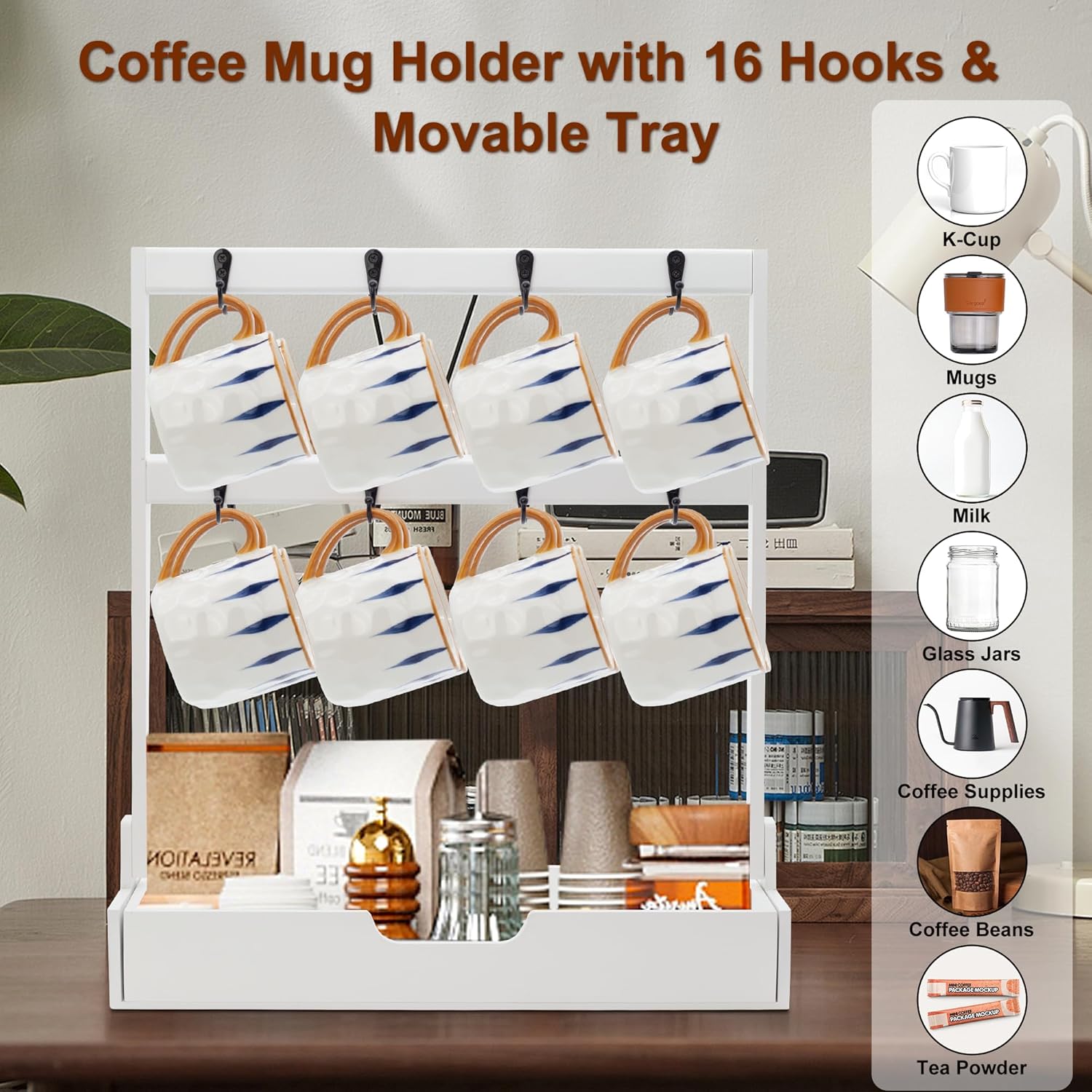 - Convenient and Flexible Drawer: The coffee mugs holder includes a tray drawer, ideals for store and display coffee pods, coffee beans, syrup, sugar packet, tea bags, creamer, snacks or other small decor items, provides plenty of space for your coffee essentials, suitable for any home kitchen or office coffee station!