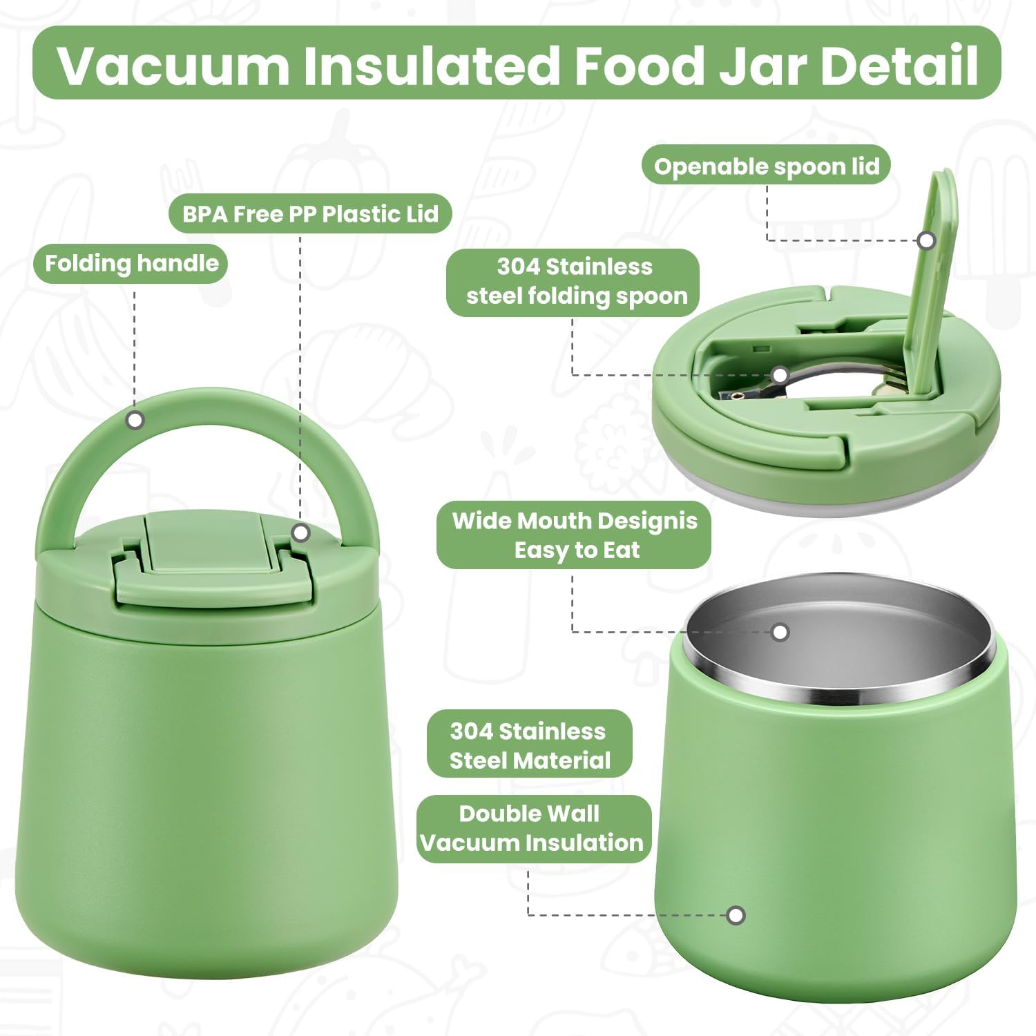 20oz Insulated Vacuum Food Jar with Buckle Lid,Soup Thermo for Hot Food Kids,Wide Mouth Leakproof Stainless Steel Lunch Container with Spoon-Green