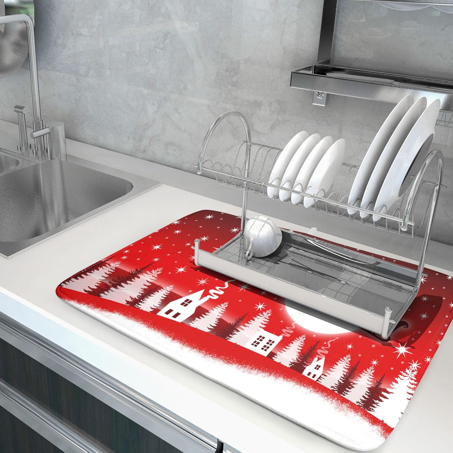 Christmas Reindeer Moon Star Red Dish Drying Mat for Kitchen Counter,White Xmas Tree Castle Drying Mat 18 x 24 Inch with Absorbent Reversible Microfiber Dish Drying Pad for Coffee Bar