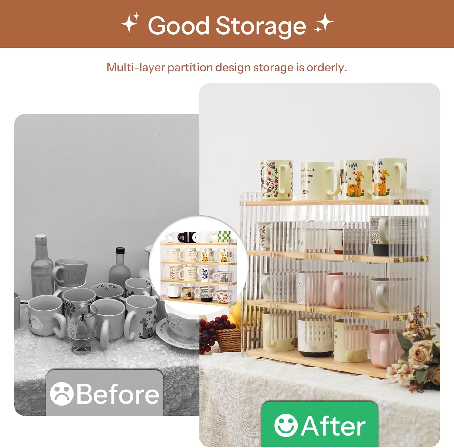 - Stylish Design: Featuring wavy acrylic side panels and a natural wood board. The sturdy construction ensures that it can hold the weight of multiple mugs without wobbling or tipping. this organizer presents an aesthetically pleasing texture, ideal for coffee bar enthusiasts and those who love to decorate their spaces.