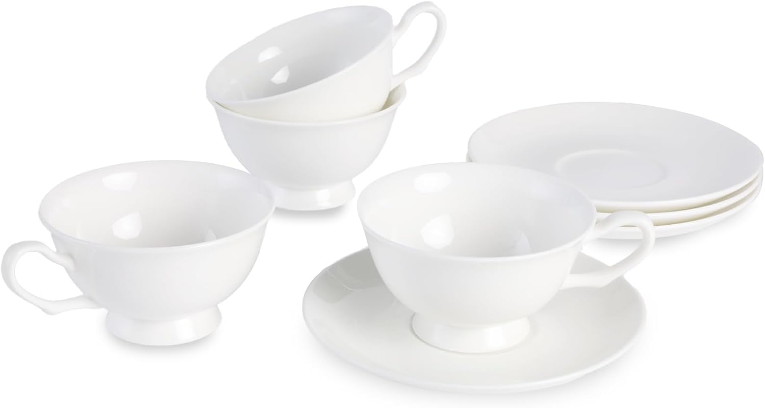 - [Elegant Design] This tea cup and saucer set includes four 5 oz white fine bone china coffee cups with non-slip saucers. The classic mini cups feature a pure white finish, perfect for latte, cappuccino, or tea time. Ideal for lovers of ceramic, elegant, or vintage tea cups