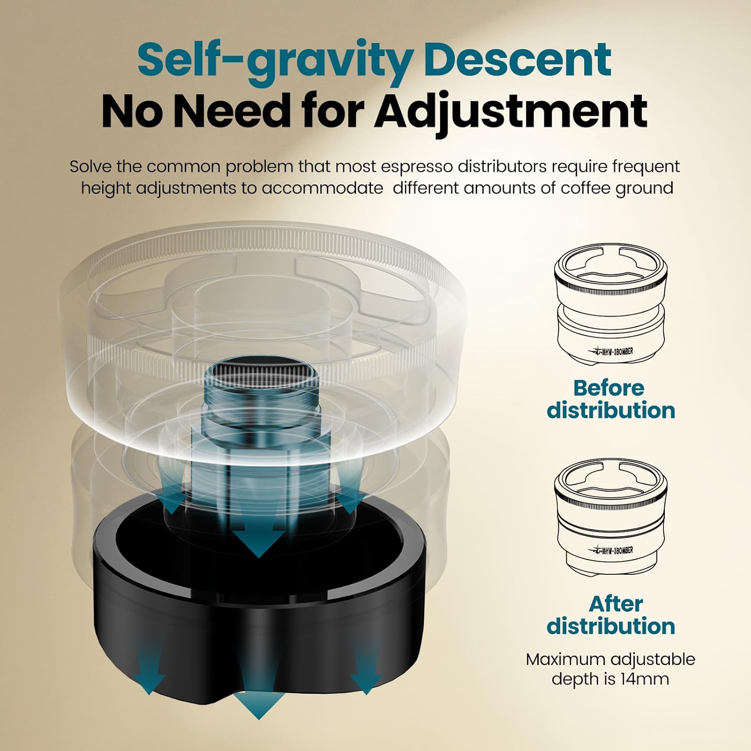 - 【Adaptive Gravity】This 58.5mm coffee leveler innovatively connects the base and top cover along a central axis, allowing for natural and uniform descent driven by gravity, facilitating even powder distribution. It resolves the common issue of frequent height adjustments required by most distributors for varying powder quantities. (Maximum leveling depth approximately 14mm)