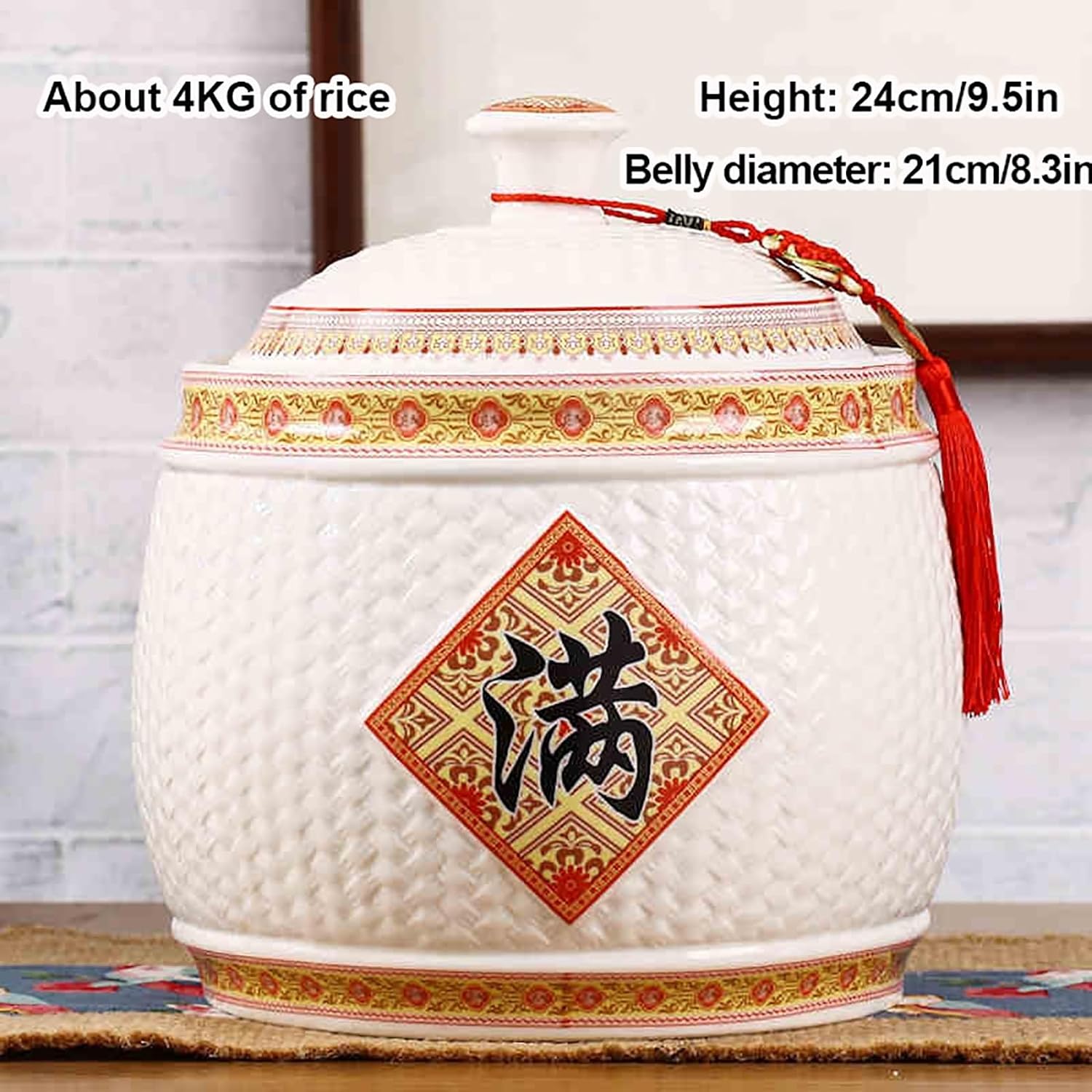 - 1. Chinese Rice tank:The Chinese style kitchen storage tank with tassel design is retro and classic; it is hand-made by various techniques such as kneading, drawing, trimming and painting; It can not only become a kitchen storage tank, but also a unique home decoration