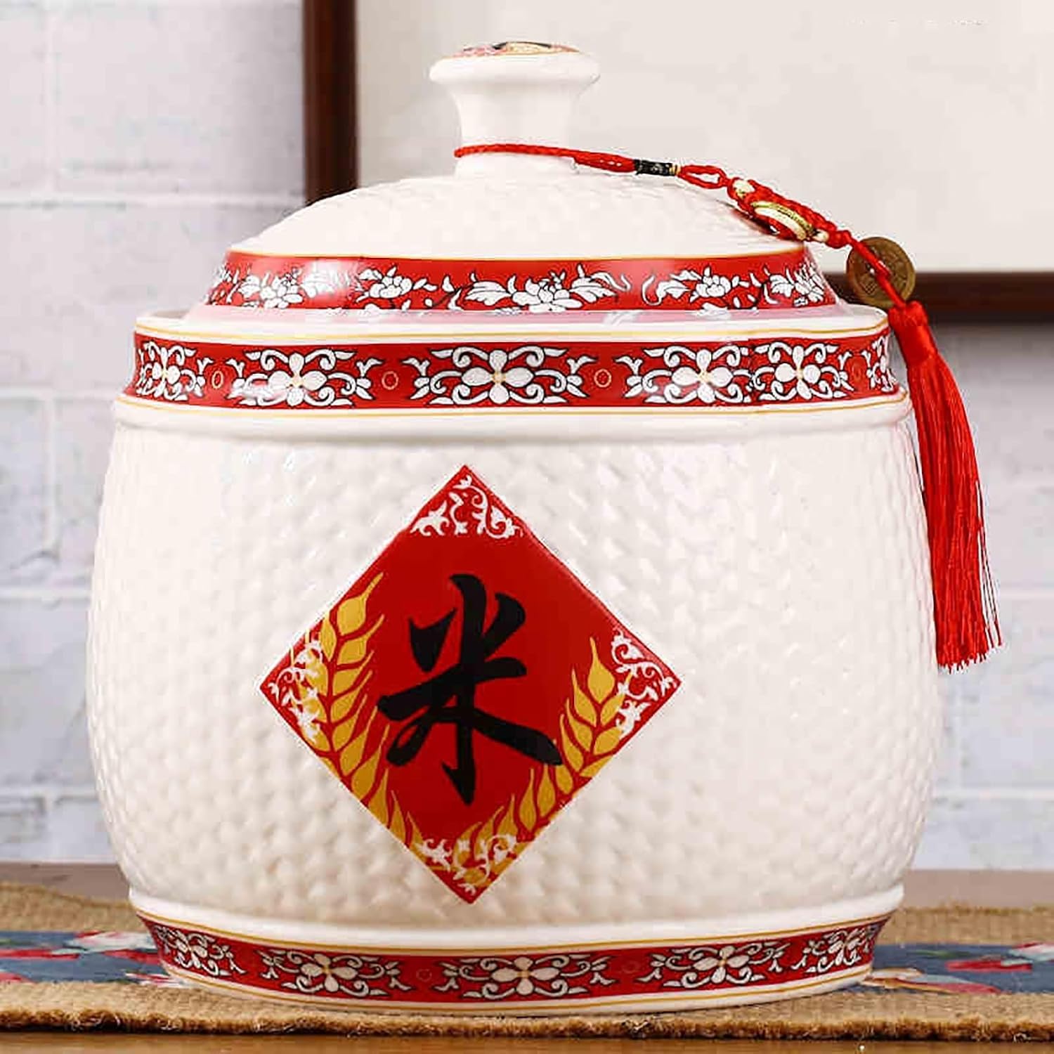 Chinese Sealed Large-Capacity Rice Pot, Ceramic Rice Bucket With Tassel Design, Grain Storage Ceramic Container, Rice Dispenser Airtight Storage Bucket For Grains Snacks Candy Coffee Beans Food(E,Capa